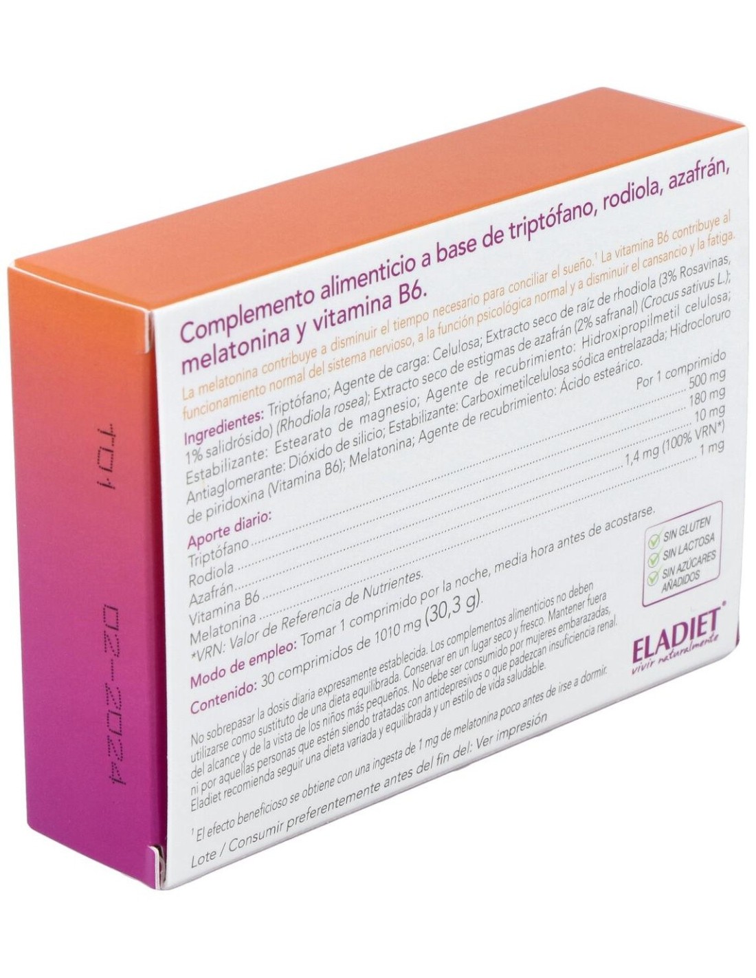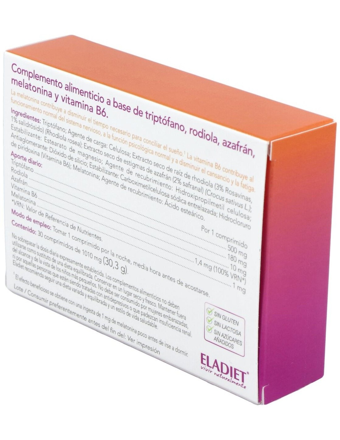 Triptófano: Agente de carga: Celulosa: Extracto seco de raíz de rodiola (3% Rosavinas, 1% salidrósido) (Rhodiola rosea): Extracto seco de estigmas de azafrán (2% safranal) (Crocus sativus): Estabilizante: Estearato de magnesio: Agente de recubrimiento: Hidroxipropilmetil celulosa: Antiaglomerante: Dióxido de silicio: Estabilizante: Carboximetilcelulosa sódica entrelazada: Colorante: Betacaroteno: Hidrocloruro de piridoxina (Vitamina B6): Melatonina: Agente de recubrimiento: Ácido esteárico.