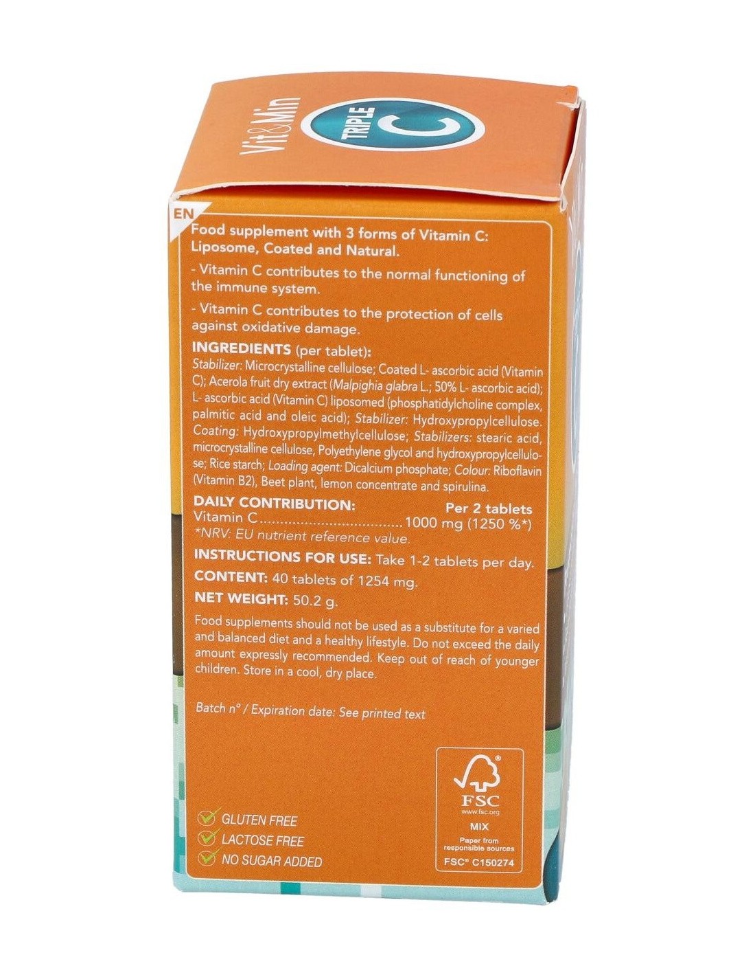 Estabilizante: celulosa microcristalina, vitamina C recubierta, extracto seco de fruto de acerola (maplphigia glabra L. 50 % vitamina C), vitamina C liposomada (complejo de fosfatidilcolina, ácido palmítico y ácido oleico), estabilizante: hidroxipropilmetilcelulosa, recubrimiento: hidroxipropilmetilcelulosa, estabilizantes: ácido esteárico, celulosa microcristalina, polietilenglicol e hidroxipropilmetilcelulosa, almidón de arroz, agente de carga: fosfato dicálcico, colorantes: riboflavina (vitamina B2), planta de remolacha, concentrado de limón, espirulina.