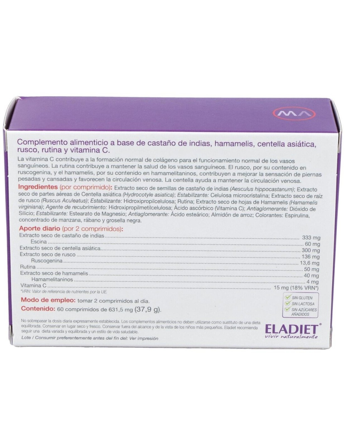 La Vitamina C contribuye a la formación normal de colágeno para el funcionamiento normal de los vasos sanguíneos. La Rutina contribuye a mantener la salud de los vasos sanguíneos. El Rusco, por su contenido en ruscogenina, y el Hamamelis, por su contenido en hamamelitaninos, contribuyen a mejorar la sensación de piernas pesadas y cansadas, y favorecen a la circulación venosa. La Centella Asiática ayuda a mantener la circulación venosa.