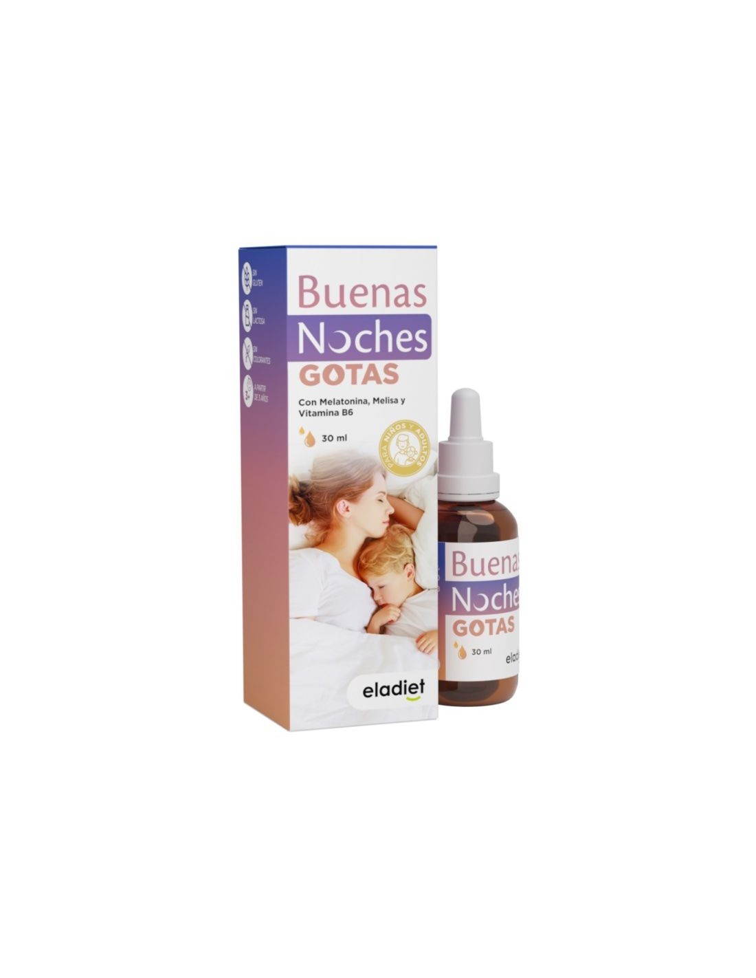 ELADIETBuenas Noches Gotas es un complemento alimenticio líquido con Melatonina que contribuye a aliviar la sensación subjetiva de desfase horario (jet lag) y a disminuir el tiempo necesario para conciliar el sueño. La vitamina B6 ayuda a disminuir el cansancio y la fatiga, y contribuye a la función psicológica normal, al funcionamiento normal del sistema nervioso y al metabolismo energético normal. Gracias a su formato en gotas, se absorbe de manera rápida y eficaz, produciendo un efecto rápido debido a sus ingredientes activos. Producto para adutos y niños a partir de 3 años.