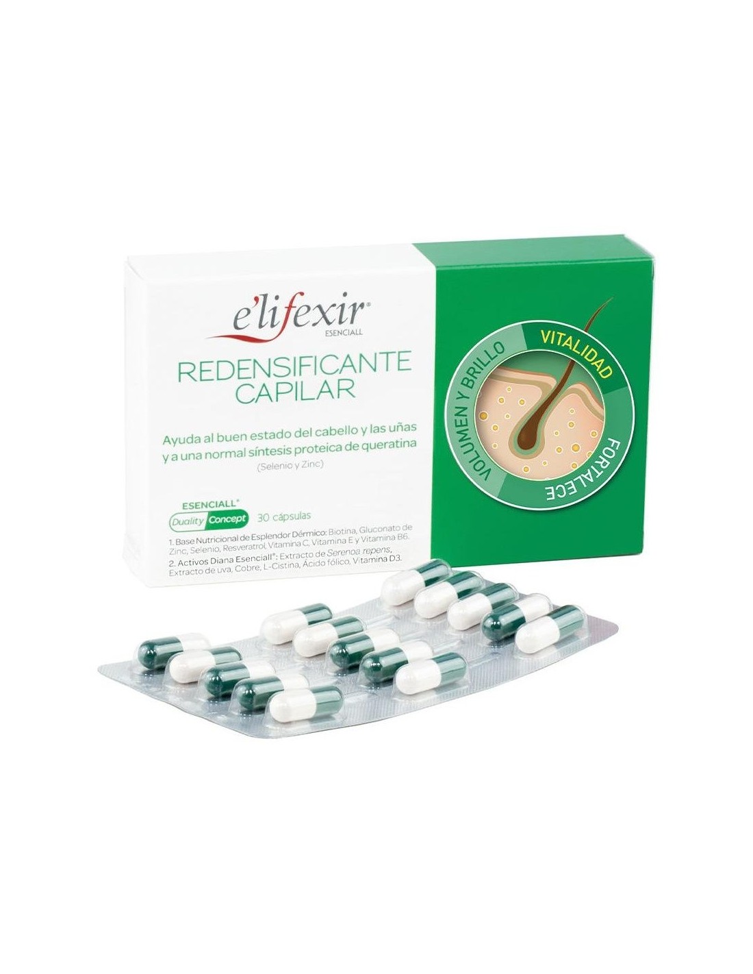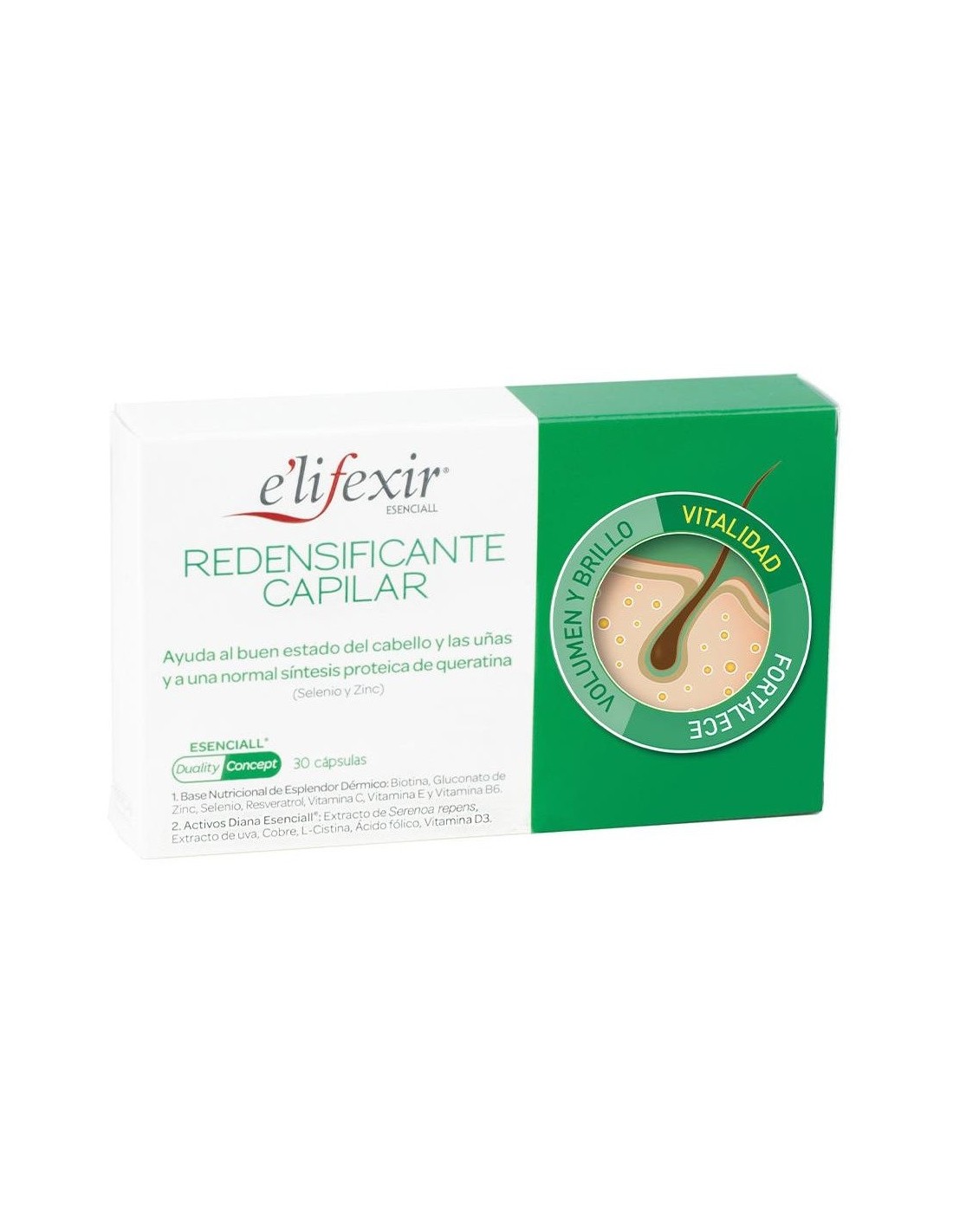 E'lifexir redensificante capilar 30cáps es un complemento alimenticio que combina extracto de serenoa repens, uva, mijo, vitamina D3 y L-cistina. Aporta nutrientes que fortalecen y mejoran el estado del cabello. Además, promueve la síntesis proteica, protege frente al daño oxidativo, ayuda a normalizar la actividad hormonal y a controlar el estrés y las principales causas de la caída del cabello.