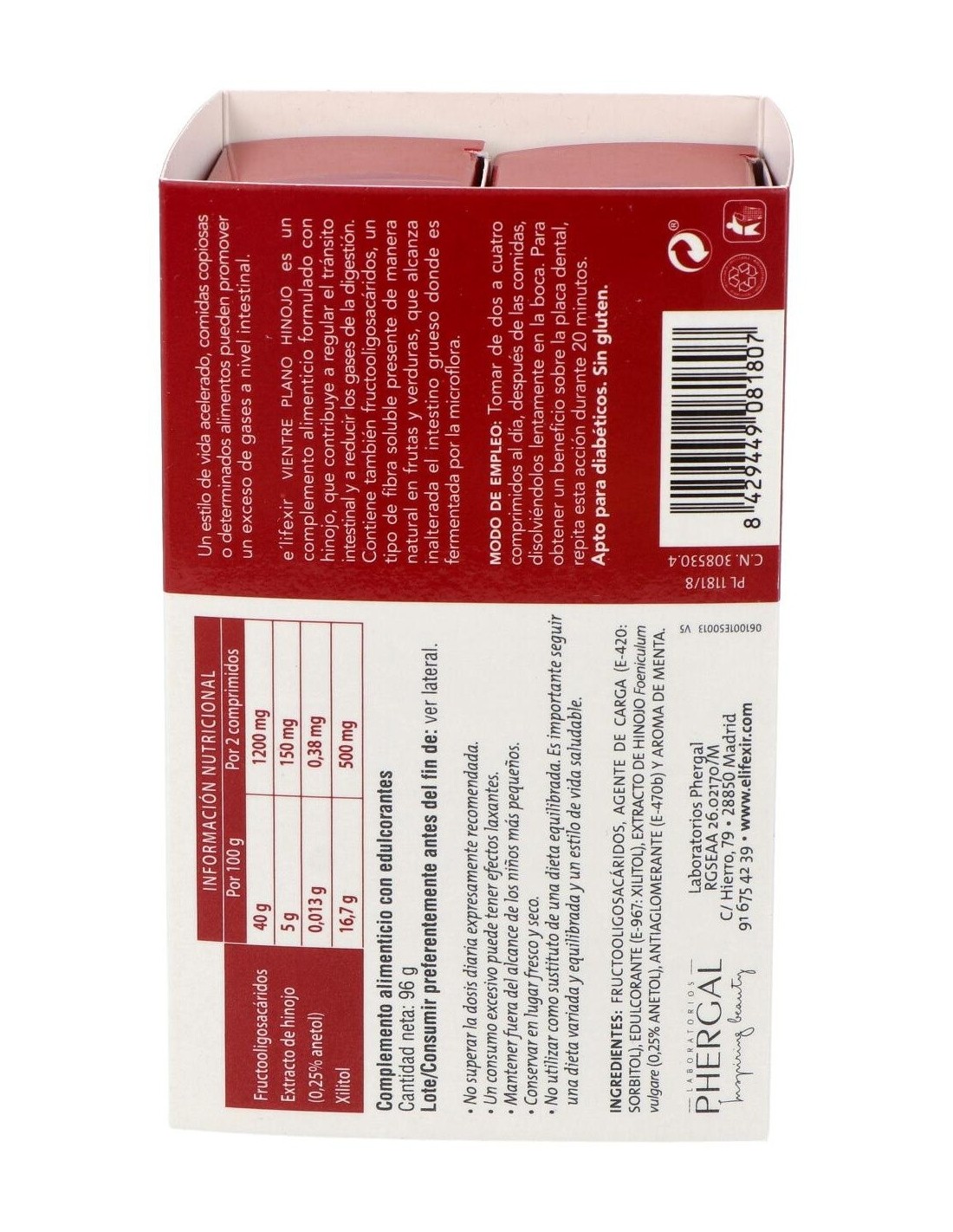 Complemento alimenticio en forma de comprimidos, elaborado a base de fibra prebiótica y extractos de hinojo, que contribuye a mejorar problemas del sistema digestivo, como la acidez, los gases, la hinchazón abdominal, la pérdida de apetito o la indigestión.