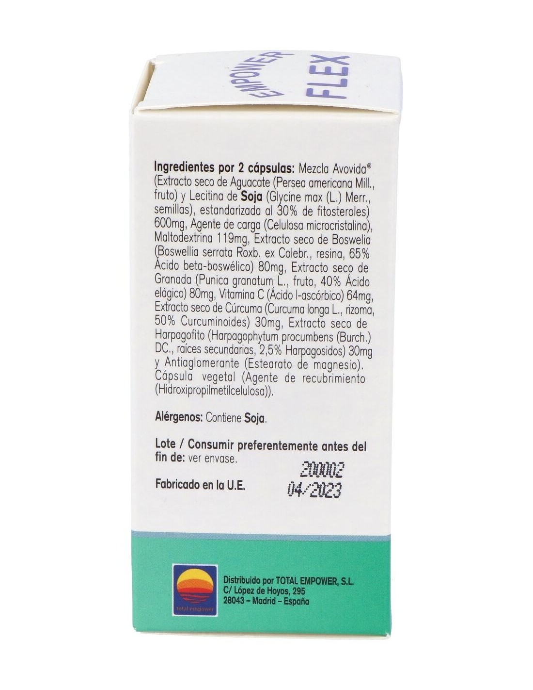Mezcla Avovida* (Extracto Seco De Aguacate (Persea Americana Mill., Fruto) Y Lecitina De Soja (Glycine Max (L.) Merr., Semillas) , Estandarizada Al 30% De Fitoesteroles) 600 mg.;Agente De Carga (Celulosa Microcristalina) ; Maltodextrina 119 mg; Extracto Seco De Boswellia (Boswellia Serrata Roxb. Ex Cole Br., Resina,65% Ácido Beta-Boswélico) 80 mg, Extracto Seco De Granada (Punica Granatum L., Fruto, 40% Ácido Elágico) 80 mg, Vitamina C ( Ácido L-Ascórbico) 64 mg, Extracto Seco De Cúrcuma (Cúrcuma Longa L., Rizoma, 50% Curcuminoides) 30 mg, Extracto Seco De Harpagofito ( Harpagophytum Procumbens (Burch.) Dc., Raíces Secundarias, 2.5% Harpagosidos) 30 mg Y Antiaglomerante (Estearato De Magnesio).