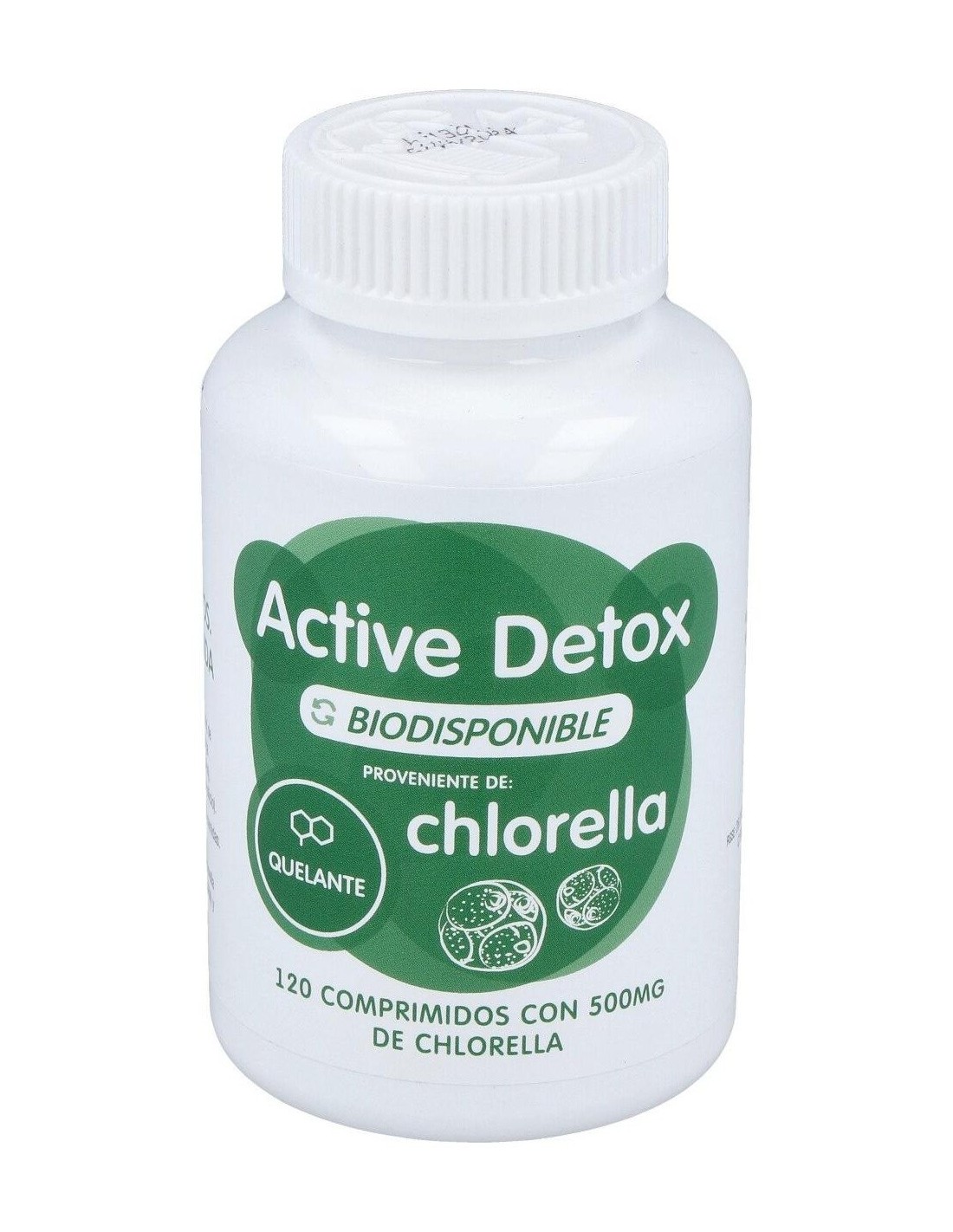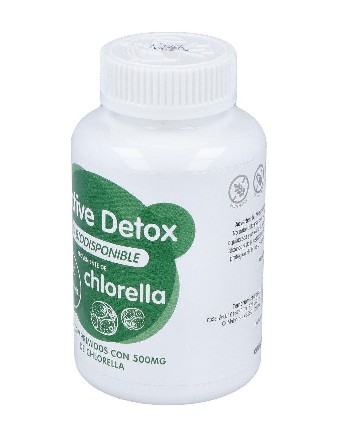 Chlorella (alga Chlorella vulgaris)(500mg), humectante (sorbitol), agente de carga (celulosa microcristalina), estabilizador (fosfato tricalcico), antiaglomerantes (estearato de magnesio y dióxido de silicio).