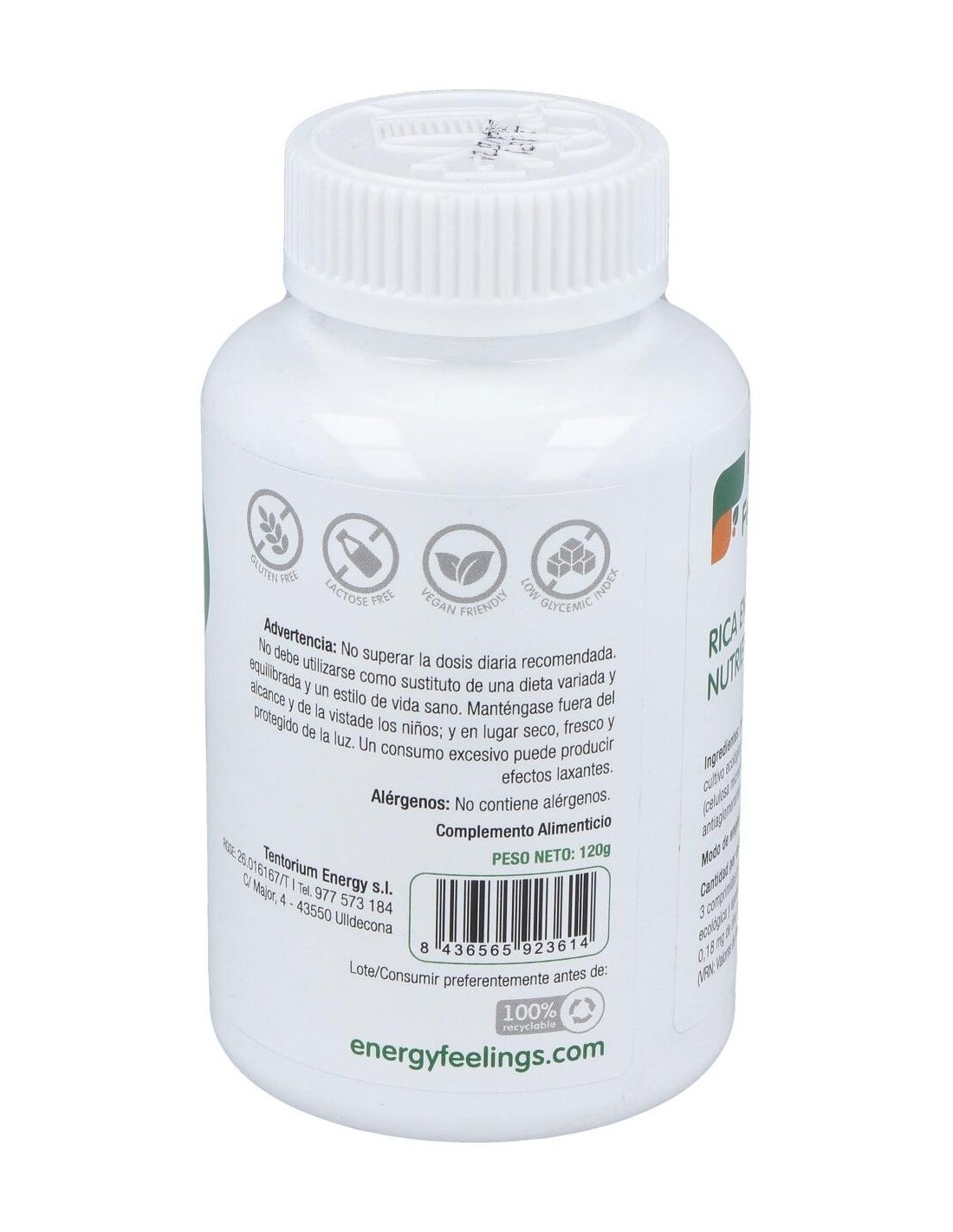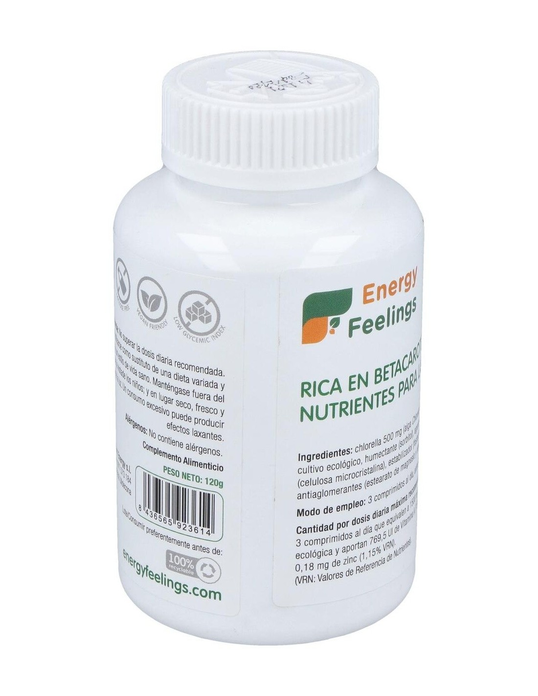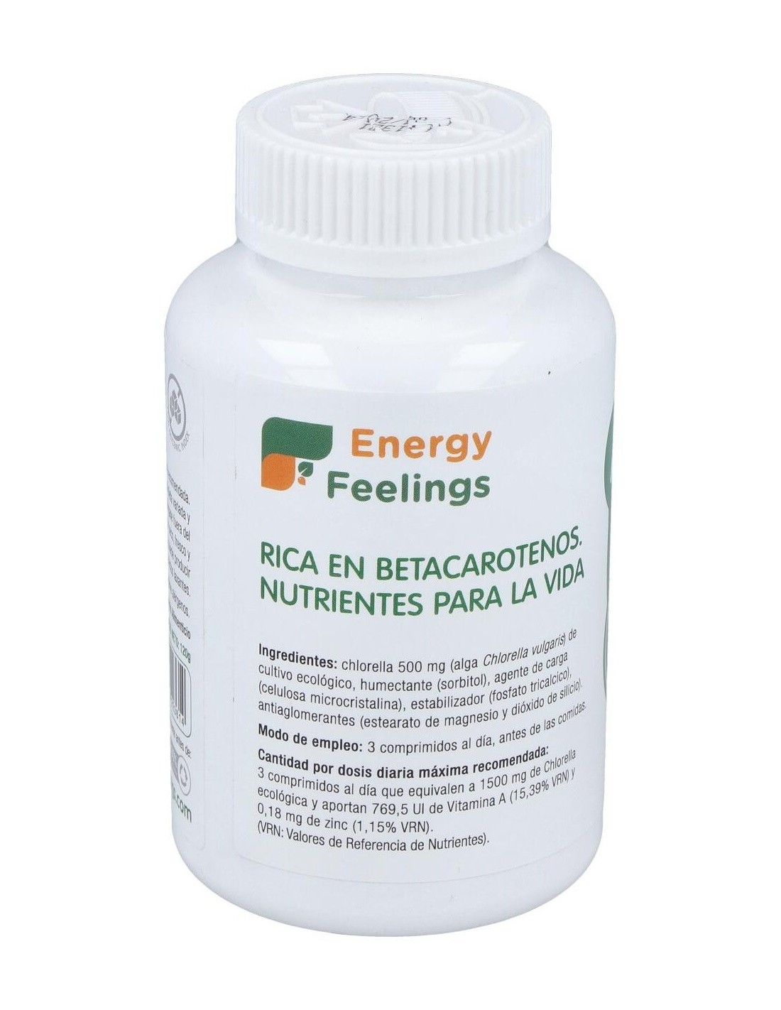 Complemento alimenticio con chlorella procedente de cultivo ecológico. Procedente de cultivo ecológico. Es una importante fuente de proteínas, del 40 al 50% de su peso en seco, y de otros nutrientes como minerales y vitaminas: magnesio, hierro, fósforo, zinc, vitamina B6, B12, A, etc. Tiene muy pocas grasas saturadas.