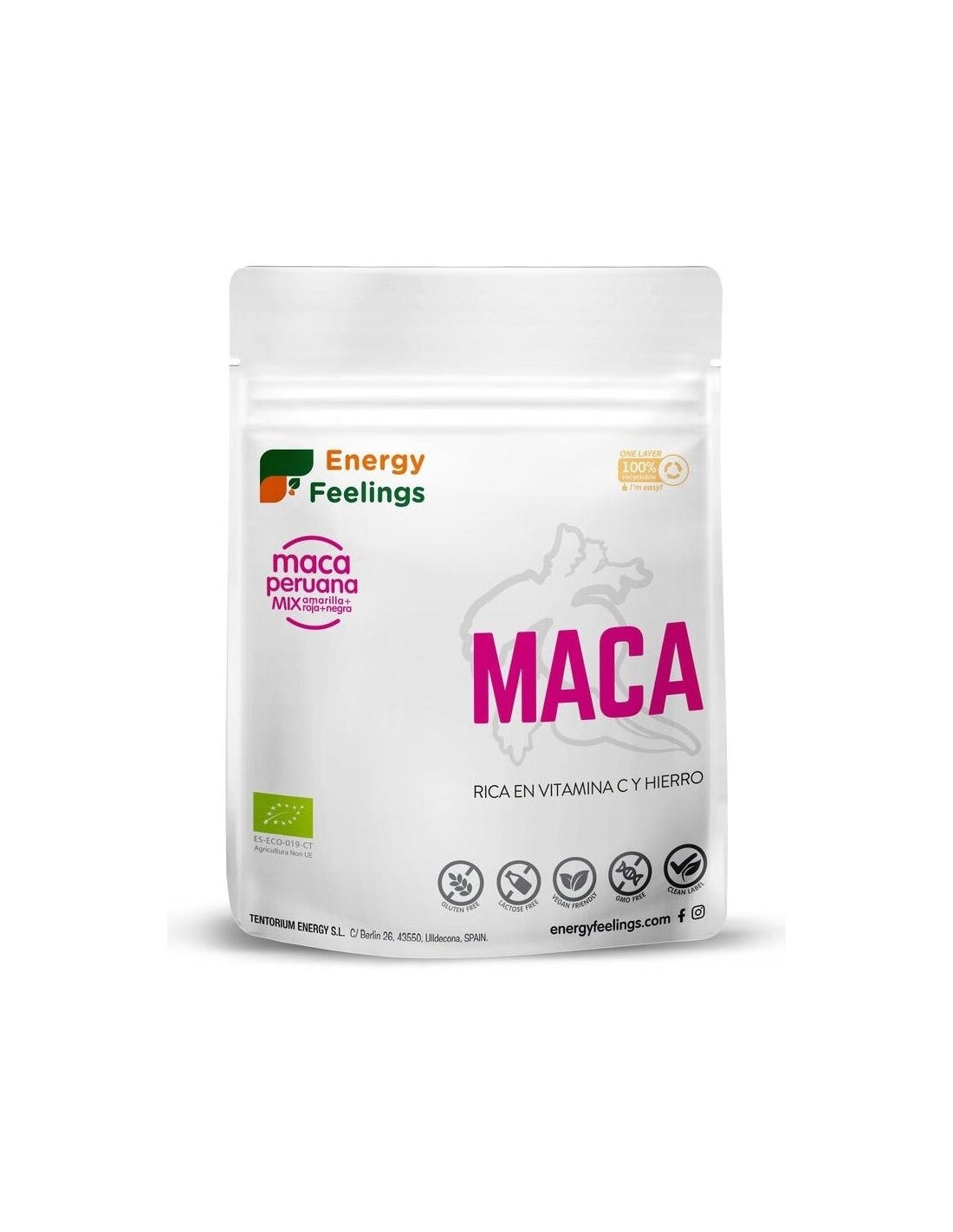ENERGY FEELINGSAlimento de máxima pureza obtenido directamente de la molienda de la variedad de maca roja. Aporta vitaminas, minerales y cuenta con certificación ecológica.