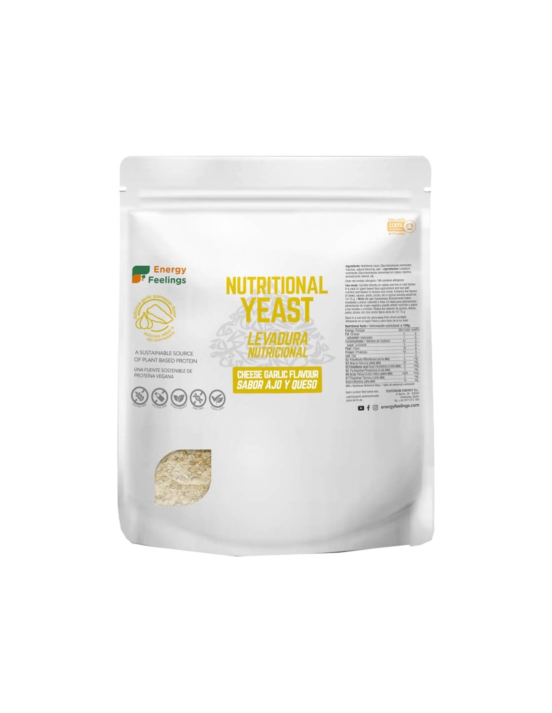 ENERGY FEELINGSLa Levadura Nutricional Ajo Parmesano de Energy Feelings es un grandioso súper alimento para enriquecer el valor nutritivo de cualquier preparación. Es inactiva y no provoca el desarrollo de levaduras en el tracto intestinal. Con 43% de proteínas biodisponibles es extraordinariamente rica en todas las vitaminas del grupo B: B1, B2, B3, B5, B6, B9. Especialmente pensado para las personas veganas y flexi veganas. A diferencia de la más comúnmente comercializada levadura de cerveza, La Levadura Nutricional Ajo Parmesano de Energy Feelings es un producto concebido para la alimentación humana, puro y limpio, libre de los residuos potencialmente tóxicos de la industria cervecera y con un delicioso sabor a ajo parmesano. Sin gluten ni lactosa. Producto vegano.