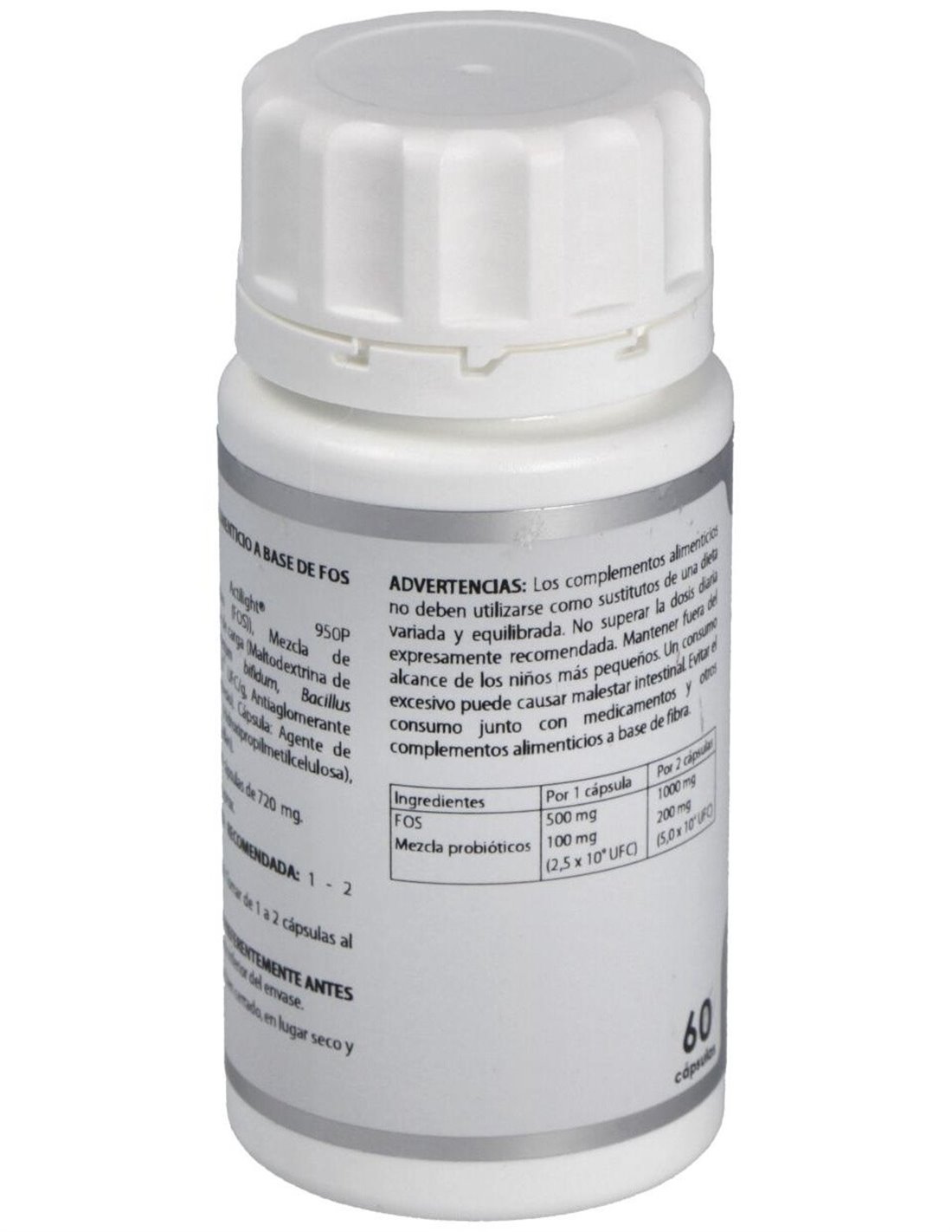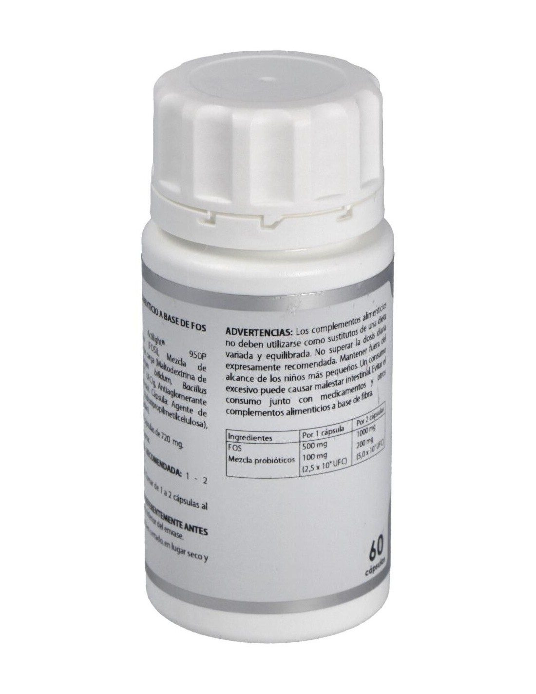 Actilight® 950P (Fructo-oligosacáridos (FOS)), 500 mg: mezcla de probióticos (maltodextrina de maíz (agente de carga), Bifidobacterium bifidum, Bacillus coagulans) 2,5x1010 UFC/g, 100 mg. Excipiente tecnológico: estearato de magnesio (antiaglomerante), c.s. Envoltura: agente de recubrimiento (hidroxipropilmetilcelulosa) y gelificante (goma gellan).