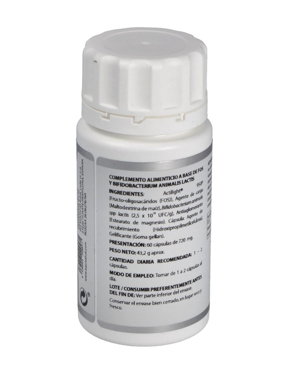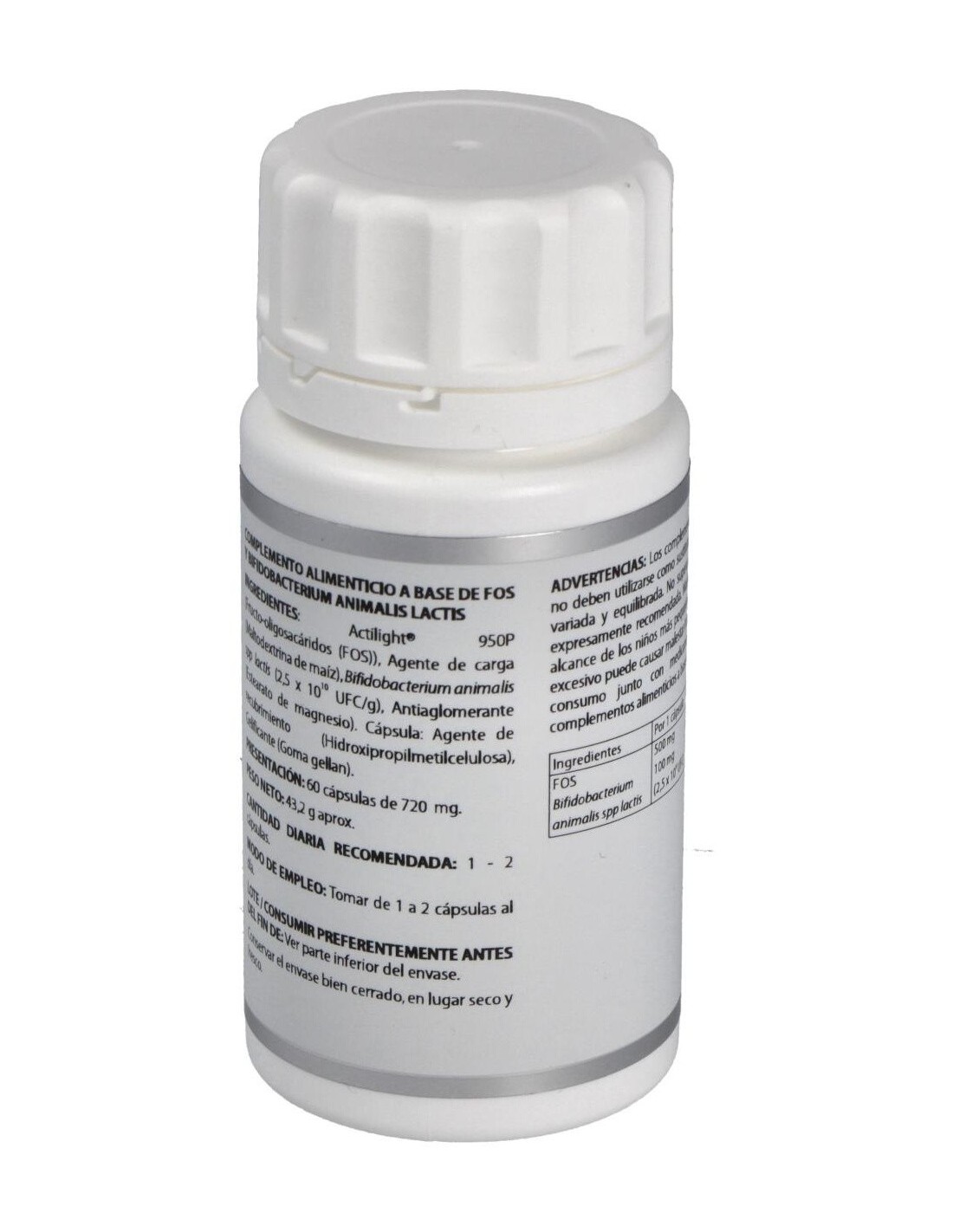 Actilight® 950P (Fructo-oligosacáridos (FOS)), 500 mg: Bifidobacterium animalis spp lactis (maltodextrina de maíz (agente de carga), Bifidobacterium animalis spp lactis LMG 18314) 2,5x1010 UFC/g, 100 mg. Excipiente tecnológico: estearato de magnesio (antiaglomerante), c.s. Envoltura: agente de recubrimiento (hidroxipropilmetilcelulosa) y gelificante (goma gellan)
