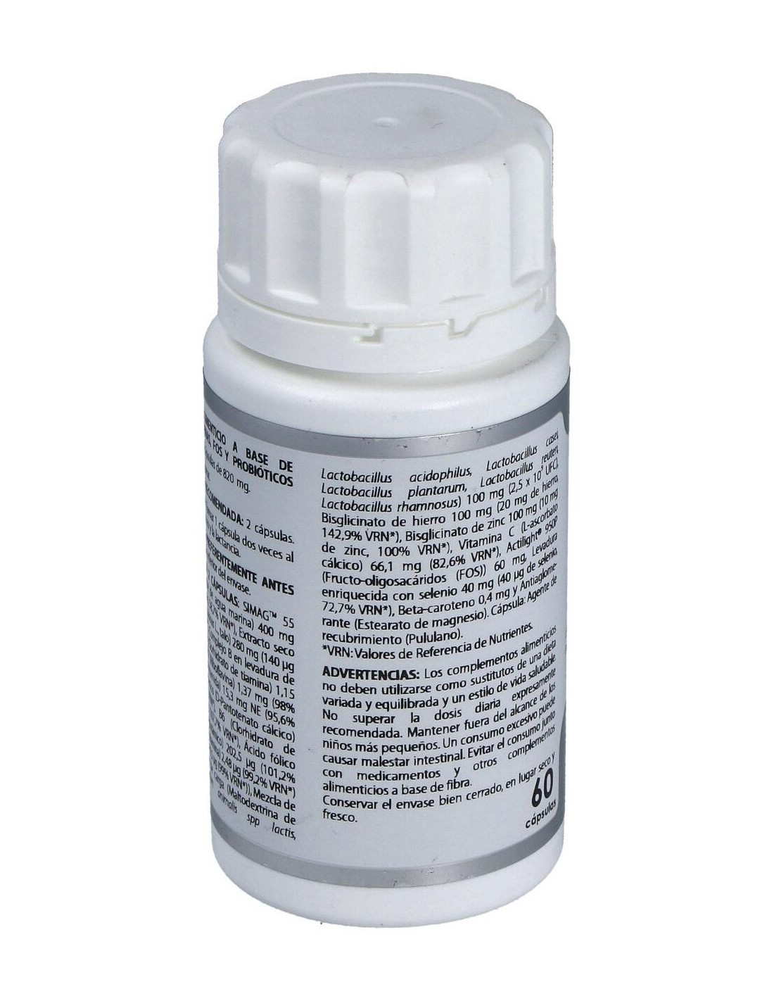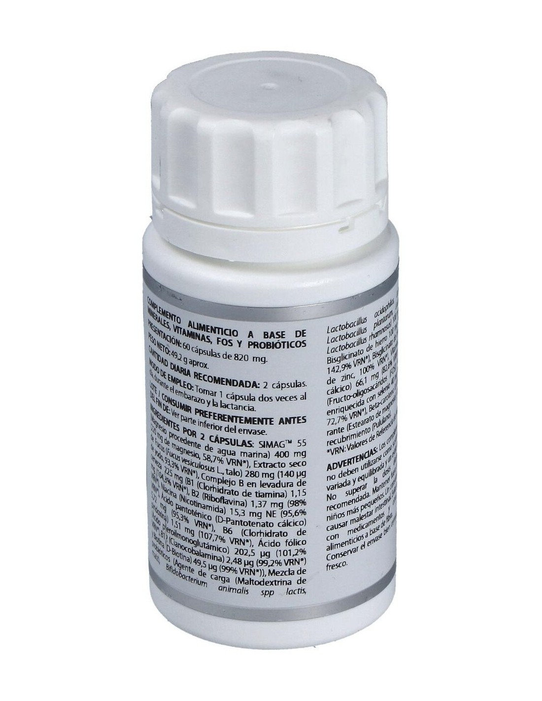 SIMAGTM 55 (magnesio procedente de agua marina, =55% magnesio), 200 mg; fucus extracto seco (Fucus vesiculosus L., talo, 0,05% yodo), 140 mg; complejo de vitaminas B (B1 (tiamina clorhidrato) 51.000 ppm, B2 (riboflavina) 6.100 ppm, niacina (nicotinamida) 68.000 ppm, B5 (D-pantotenato cálcico) 25.400 ppm, B6 (piridoxina clorhidrato) 6.700 ppm, D-biotina 220 ppm, ácido fólico 900 ppm, B12 (cianocobalamina) 11 ppm) en levadura de cerveza, 112,5 mg; mezcla de probióticos Lactagest* (2,5×1010 UFC/g), 50 mg; bisglicinato de hierro (20-23% hierro), 50 mg; bisglicinato de zinc (10% zinc), 50 mg; L-ascorbato cálcico (82,64% vitamina C), 40 mg; Actilight® 950P (Fructo-oligosacáridos (FOS)), 30 mg; levadura enriquecida con selenio (1.000 ppm selenio), 20 mg; beta-caroteno 10%, 2 mg.