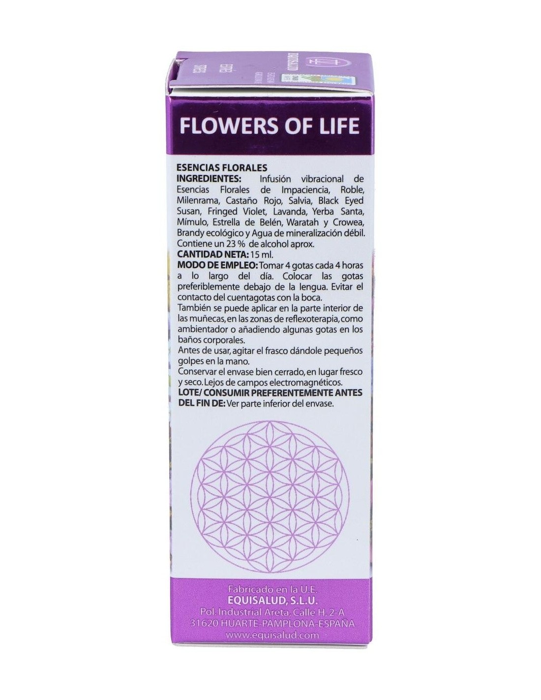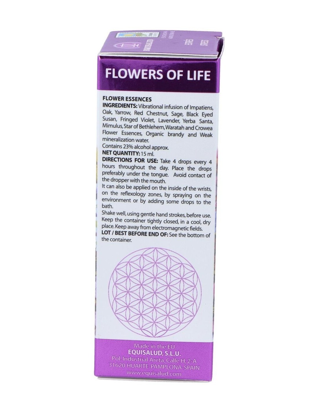 Infusión vibracional de esencias florales de Impaciencia, Roble, Milenrama, Castaño Rojo, Salvia, Black Eyed Susan, Fringed Violet, Lavanda, Yerba Santa, Mímulo, Estrella de Belén, Waratah y Crowea: brandy ecológico y agua de mineralización débil.