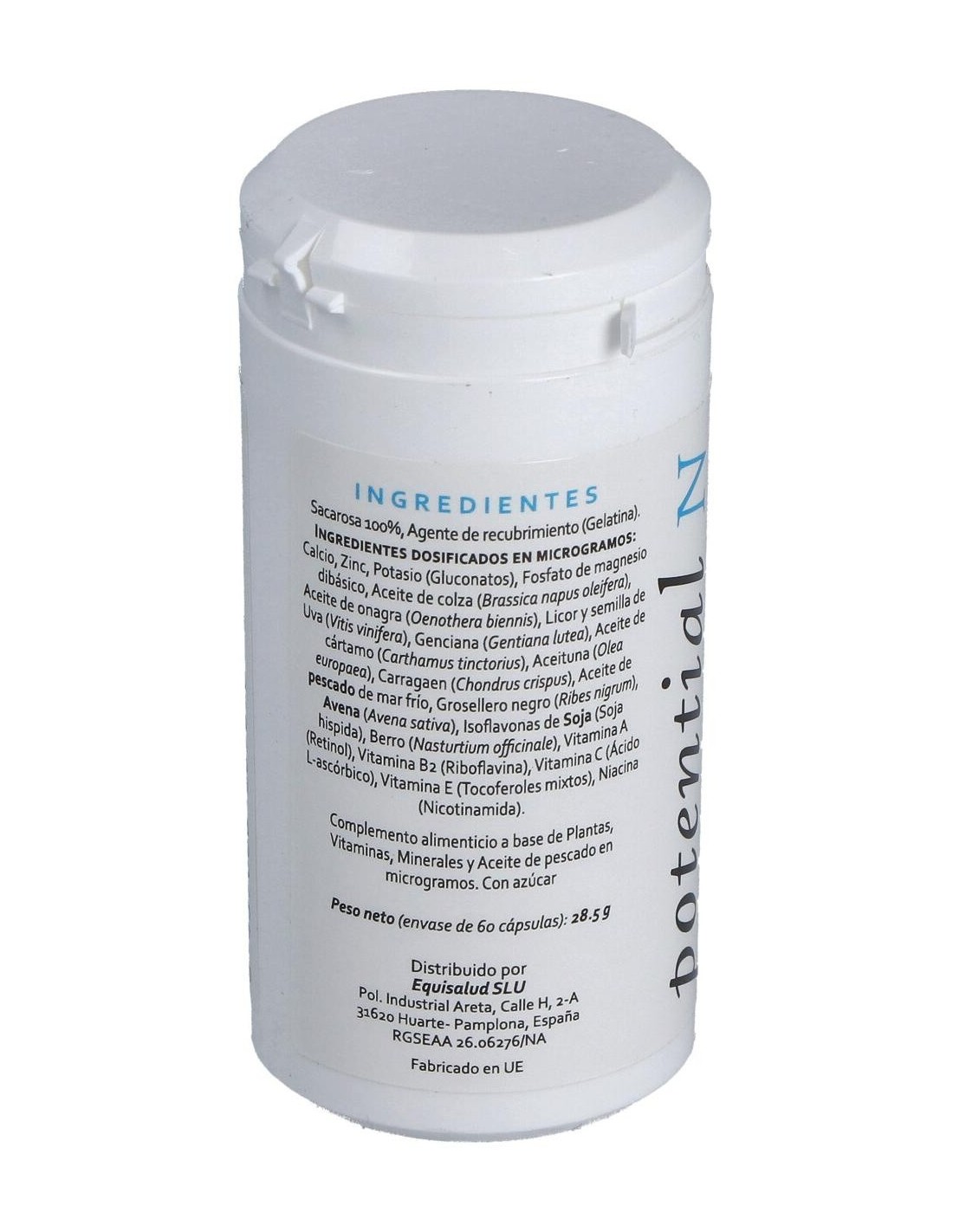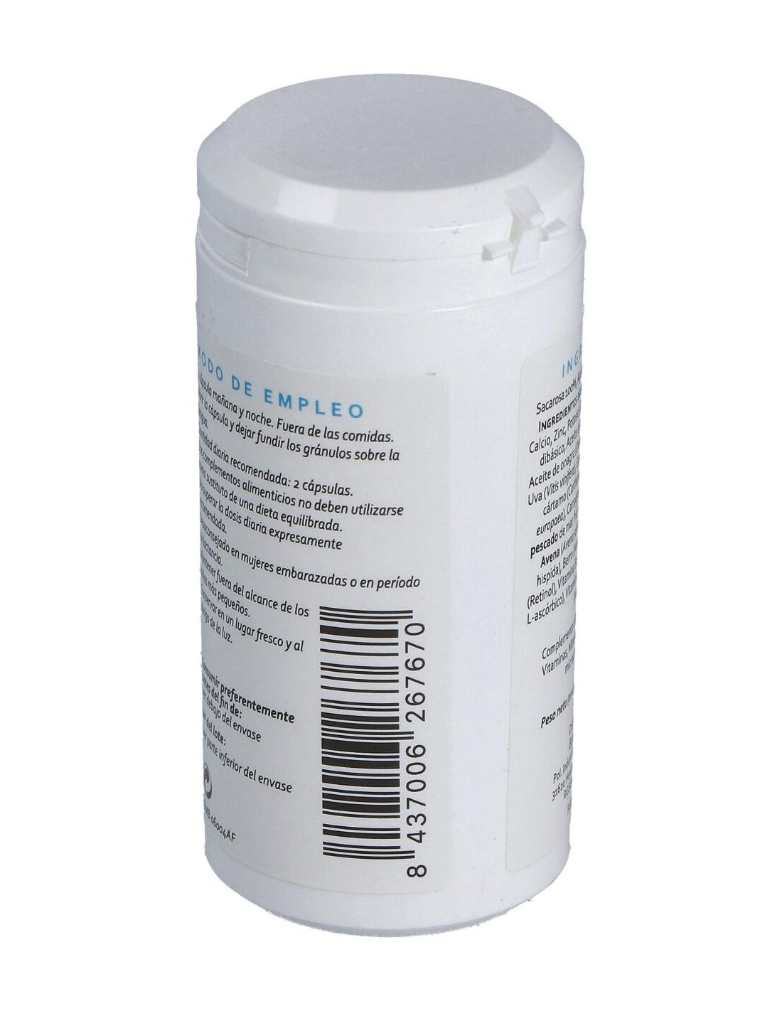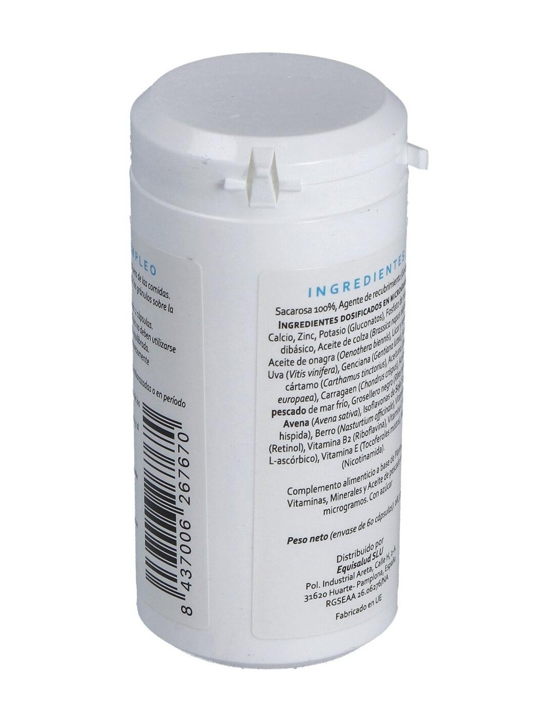 Calcio, zinc y potasio (gluconatos), fosfato de magnesio dibásico. Aceite de colza (Brassica napus oleifera), aceite de onagra (Oenothera biennis), licor y semilla de uva (Vitis vinifera), genciana (Gentiana lutea), aceite de cártamo (Carthamus tinctorius), aceituna (Olea europaea), carragaen (Chondrus crispus), aceite de pescado de mar frío, grosellero negro (Ribes nigrum), avena (Avena sativa), isoflavonas de soja (Soja hispida), berro (Nasturtium officinale). Vitamina A (retinol), vitamina B2 (riboflavina), vitamina C (ácido L-ascórbico), vitamina E (mezcla de tocoferoles), niacina (nicotinamida). Agente de recubrimiento (gelatina), sacarosa 100%.