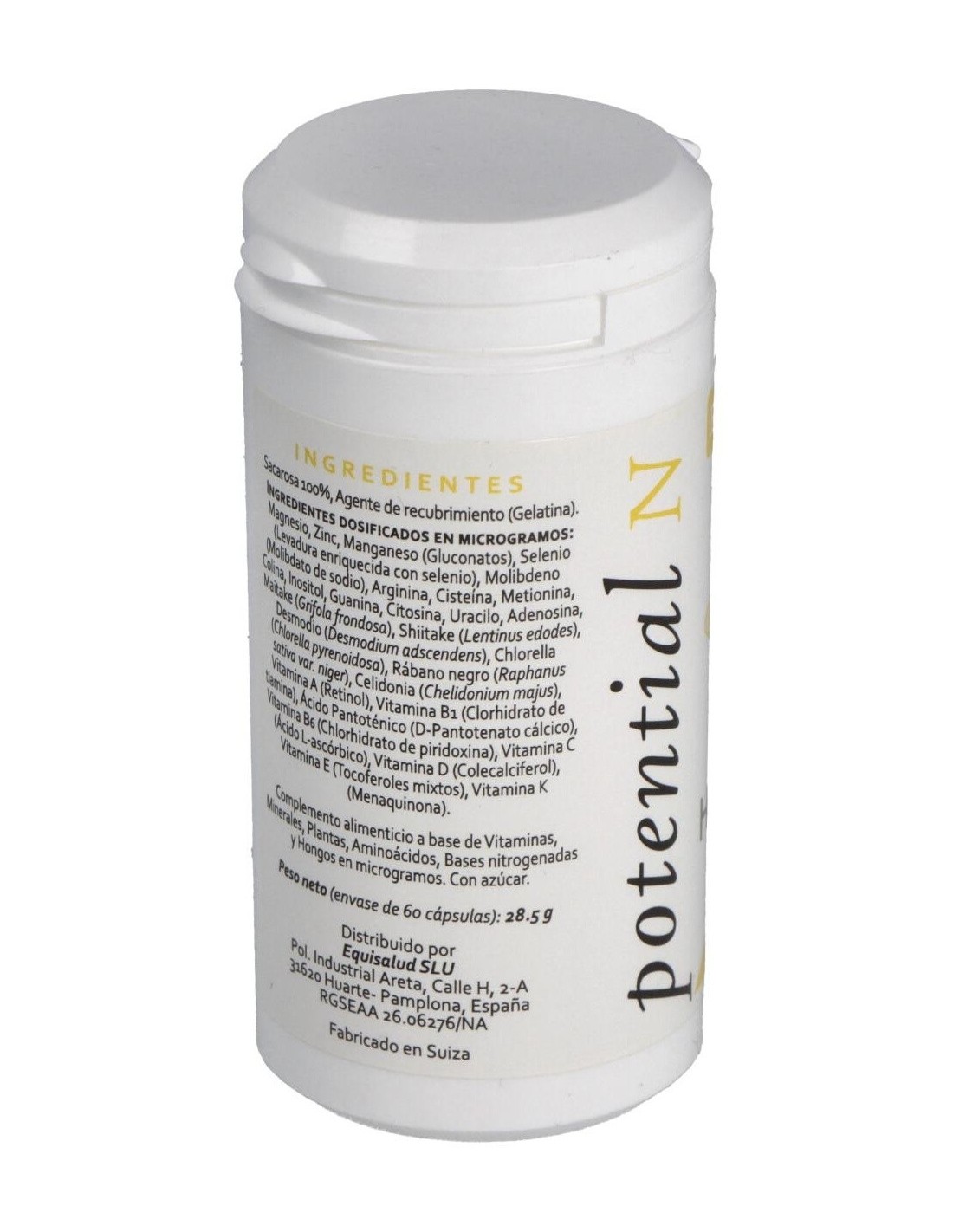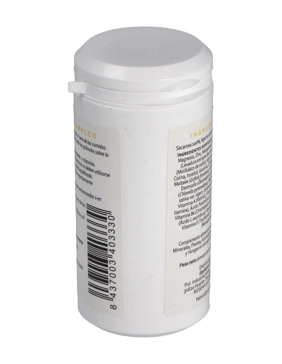 Minerales: magnesio, zinc y manganeso (gluconatos), selenio (levadura enriquecida con selenio), molibdeno (molibdato de sodio). Aminoácidos: arginina, cisteína, metionina, colina, inositol, guanina, citosina, uracilo, adenosina. Plantas: desmodio (Desmodium adscendens), chlorella (Chlorella pyrenoidosa), rábano negro (Raphanus sativus var. niger), celidonia (Chelidonium majus). Hongos: maitake (Grifola frondosa), shiitake (Lentinus edodes). Vitaminas: vitamina A (retinol), vitamina B1 (clorhidrato de tiamina), ácido pantoténico (D-pantotenato cálcico), vitamina B6 (clorhidrato de piridoxina), vitamina C (ácido L-ascórbico), vitamina D (colecalciferol), vitamina E (mezcla de tocoferoles), vitamina K (menaquinona). Envoltura: Agente de recubrimiento (gelatina), sacarosa 100%.