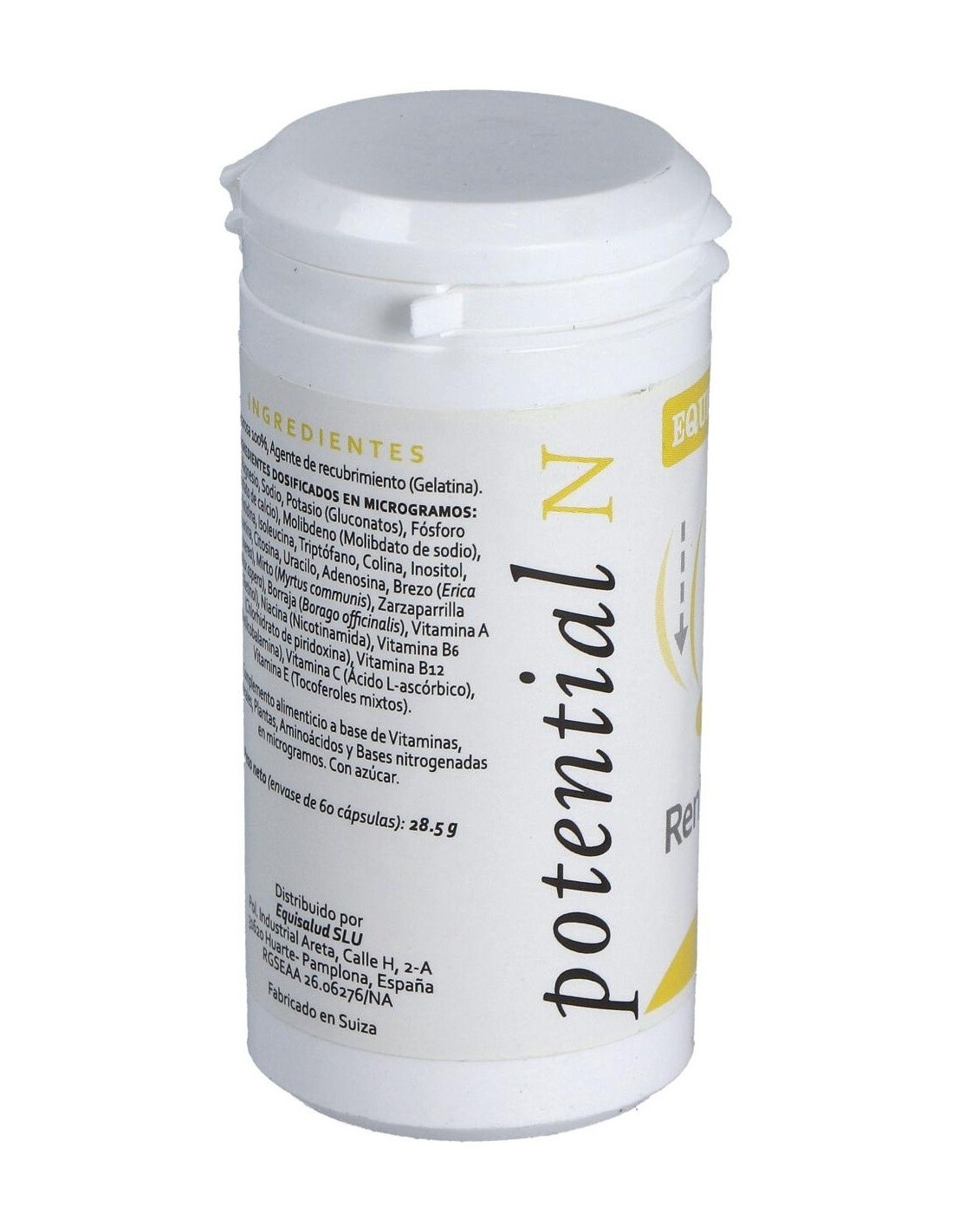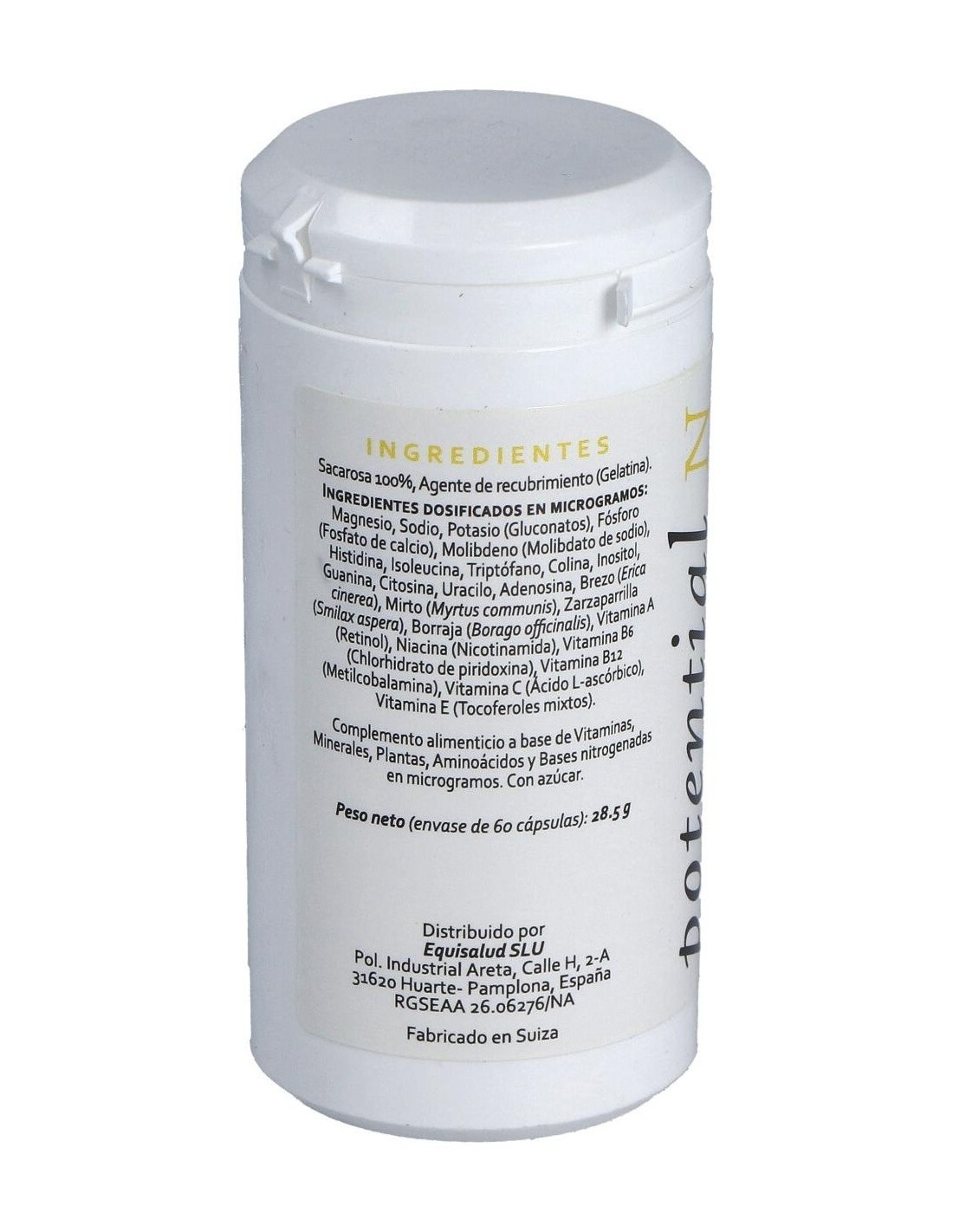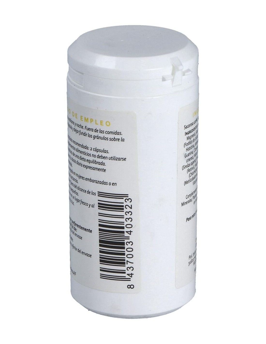Minerales: magnesio, sodio y potasio (gluconatos), fósforo (fosfato de calcio), molibdeno (molibdato de sodio). Aminoácidos: histidina, isoleucina, triptófano, colina, inositol, guanina, citosina, uracilo, adenosina. Plantas: brezo (Erica cinerea), mirto (Myrtus communis), zarzaparrilla (Smilax aspera), borraja (Borago officinalis). Vitaminas: vitamina A (retinol), niacina (nicotinamida), vitamina B6 (clorhidrato de piridoxina), vitamina B12 (metilcobalamina), vitamina C (ácido L-ascórbico), vitamina E (mezcla de tocoferoles). Envoltura: Agente de recubrimiento (gelatina), sacarosa 100%.