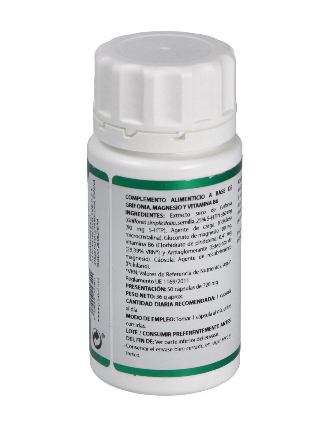 Complemento alimenticio a base de grifonia, magnesio y vitamina B6. La grifonia es rica en 5-HTP que es un precursor de la serotonina, metabolito intermedio entre el triptófano y la serotonina. En el organismo humano el 5-http rápidamente se convierte en serotonina. Esta sustancia es un neurotransmisor imprescindible para lograr la transmisión nerviosa. Apto para vegetarianos, diabéticos y pacientes con dietas restrictivas.