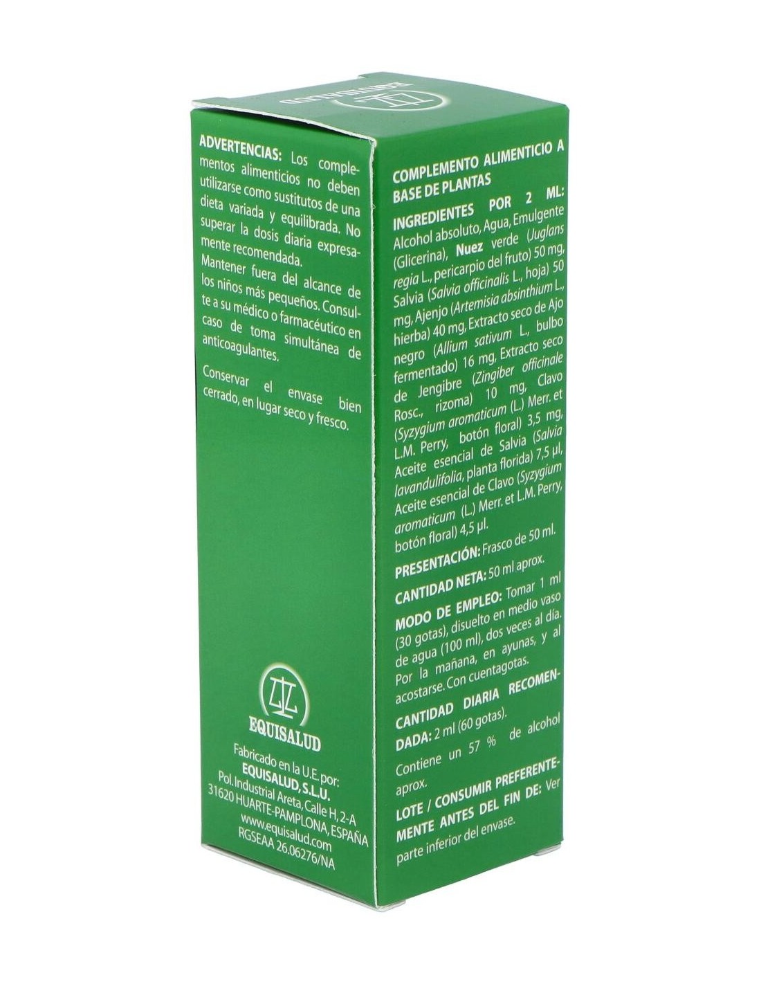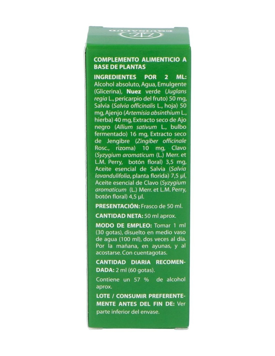 Composición por cápsula: Nuez verde (Juglans regia L., pericarpio del fruto), 1.250 mg; salvia (Salvia oficinalis L., hoja, 15 ml/Kg aceite esencial), 1.250 mg; ajenjo (Artemisa absinthium L., hierba, 2 ml/Kg aceite esencial), 1.000 mg; ajo negro extracto seco (Allium sativum L., bulbo fermentado, >1,0% S-alil-cistína (SAC)), 400 mg; jengibre extracto seco (Zingiber officinale Roscoe, rizoma, 5% gingerol), 250 mg; clavo (Syzygium aromaticum (L.) Merr. & L.M. Perry, botón floral, 150 ml/Kg aceite esencial), 87,5 mg; aceite esencial de salvia (Salvia officinalis L., planta florida), 187,5 µl y aceite esencial de clavo (Syzygium aromaticum (L.) Merr. & L.M. Perry, botón floral), 112,5 µg.