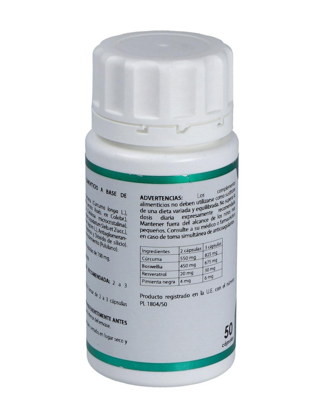 Cúrcuma extracto nebulizado (Curcuma longa L.), 275 mg: boswellia extracto seco (Boswellia serrata Roxb. ex Colebr.), 225 mg: resveratrol (Polygonum cuspidatum Sieb. et Zucc.), 10 mg: pimienta negra extracto seco (Piper nigrum L.), 2 mg. Envoltura: polisacárido de origen vegetal (pululano).