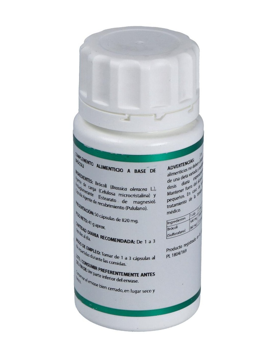 Brócoli extracto seco (Brassica oleracea L. var. italica), 500 mg. Envoltura: polisacárido de origen vegetal (pululano)