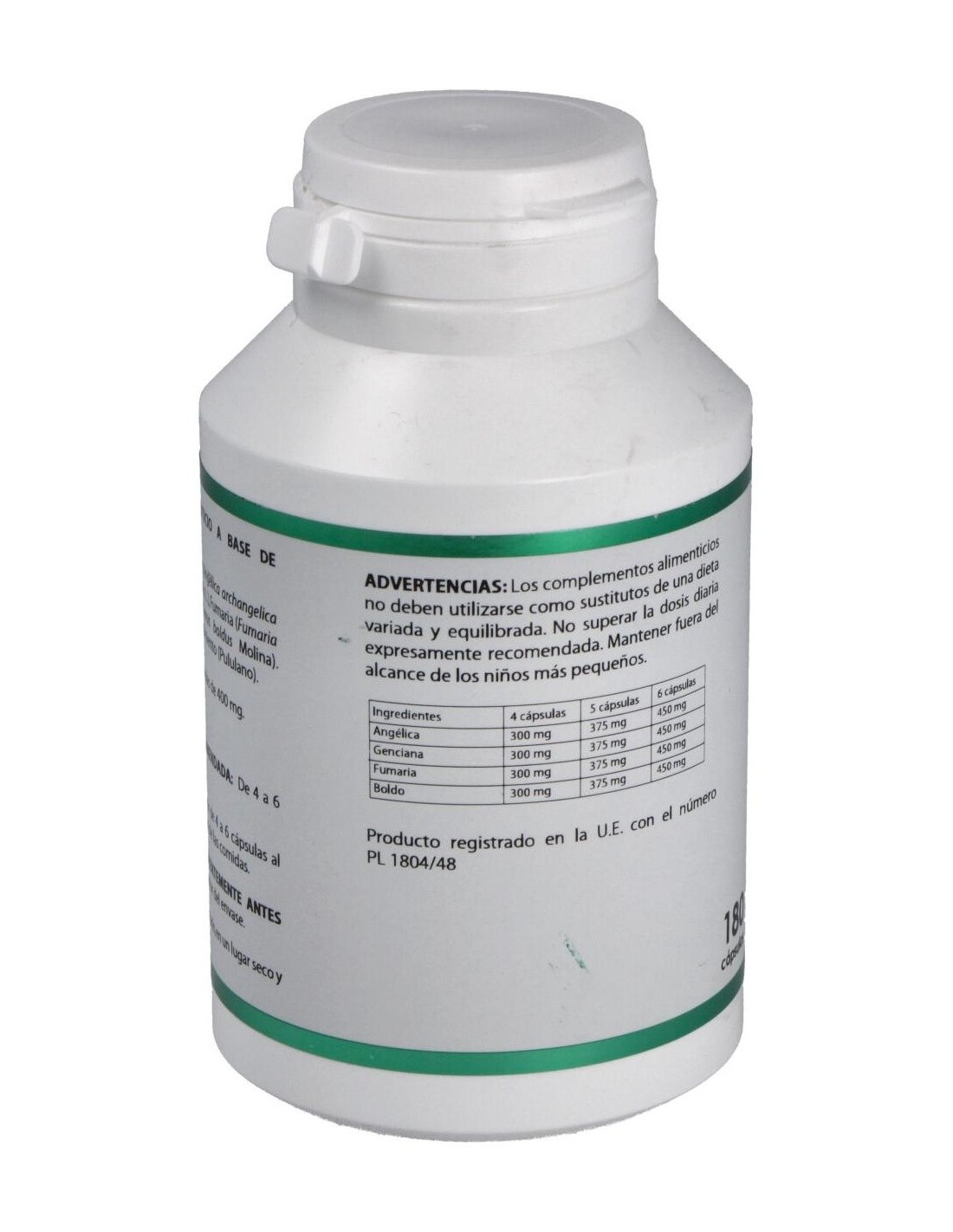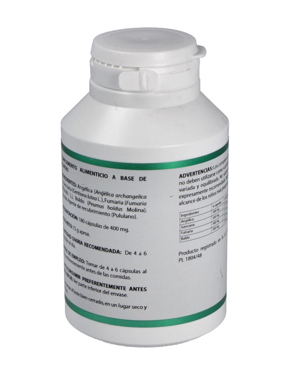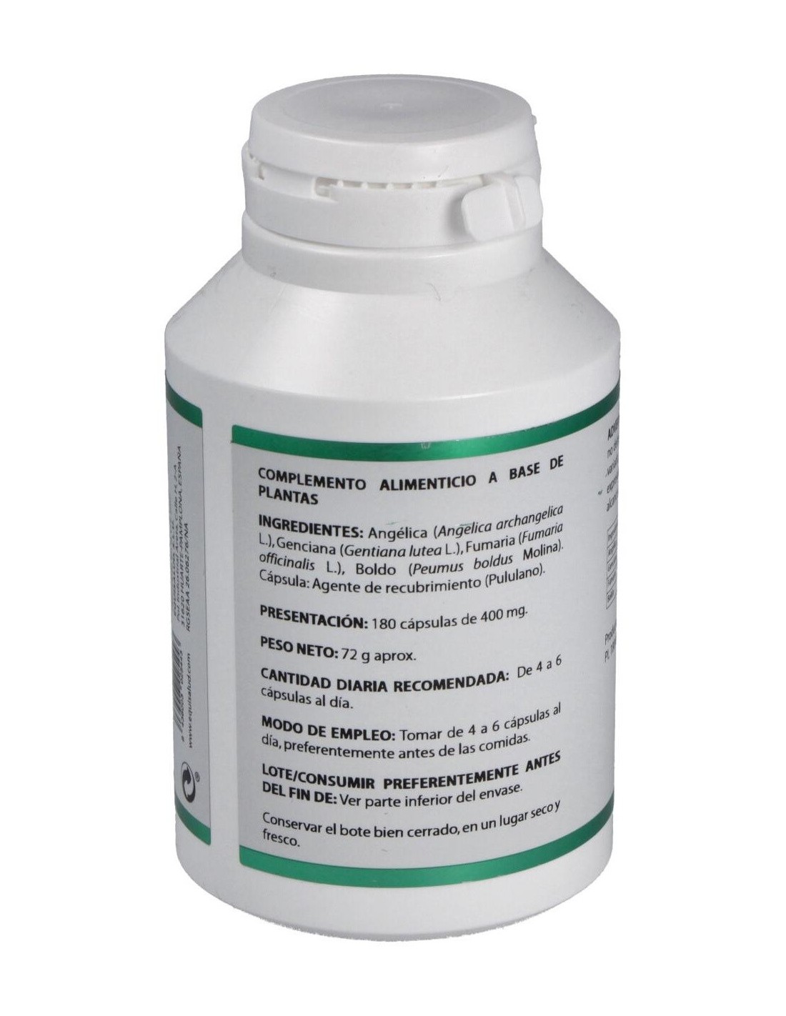 Angélica, Genciana, Fumaria, Boldo. Envoltura de polisacárido de origen vegetal (pululano)