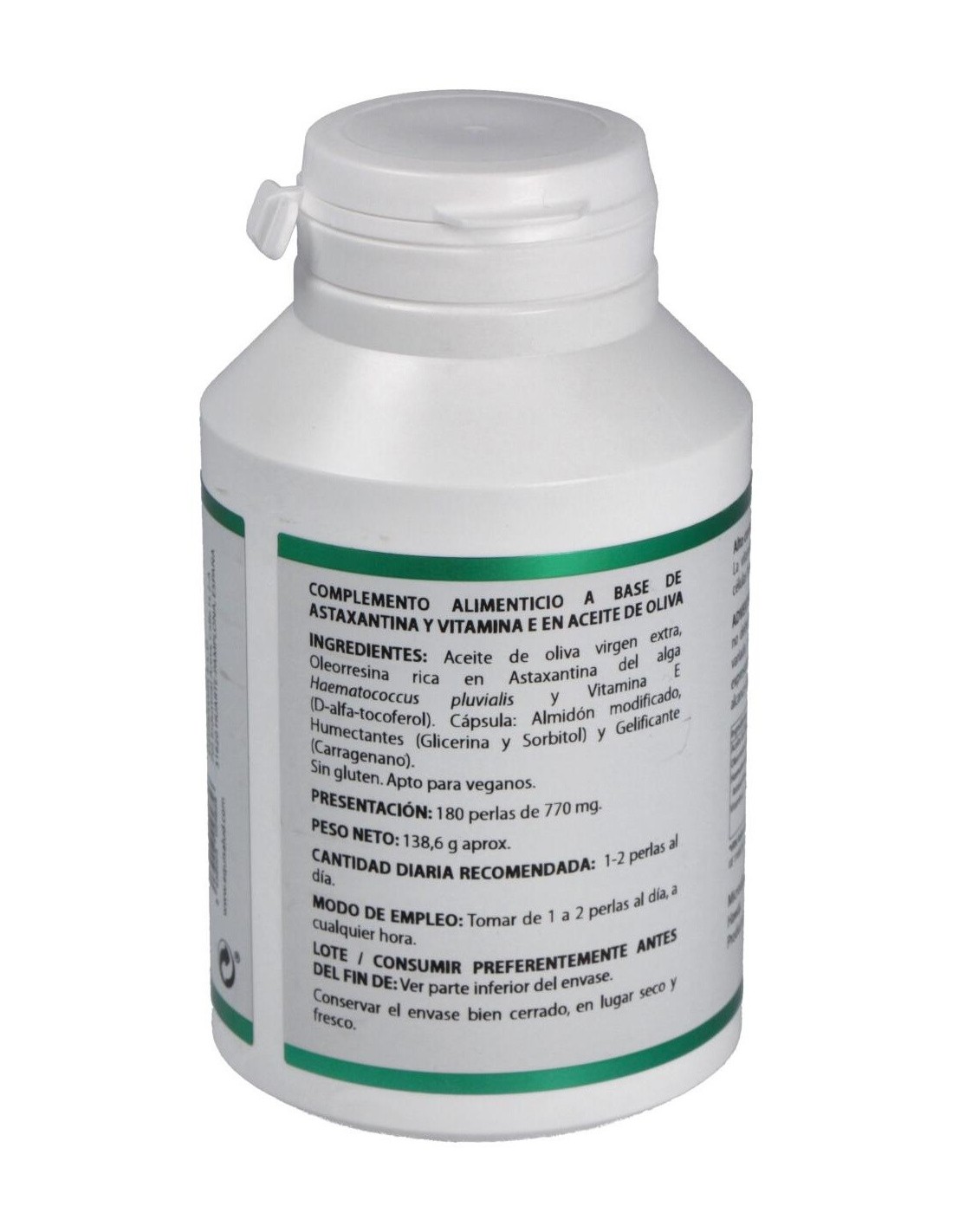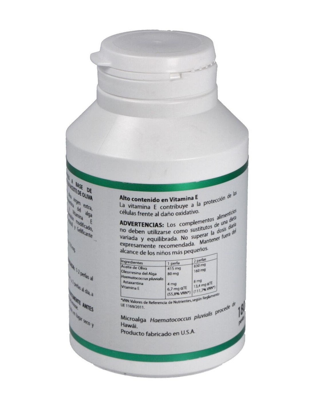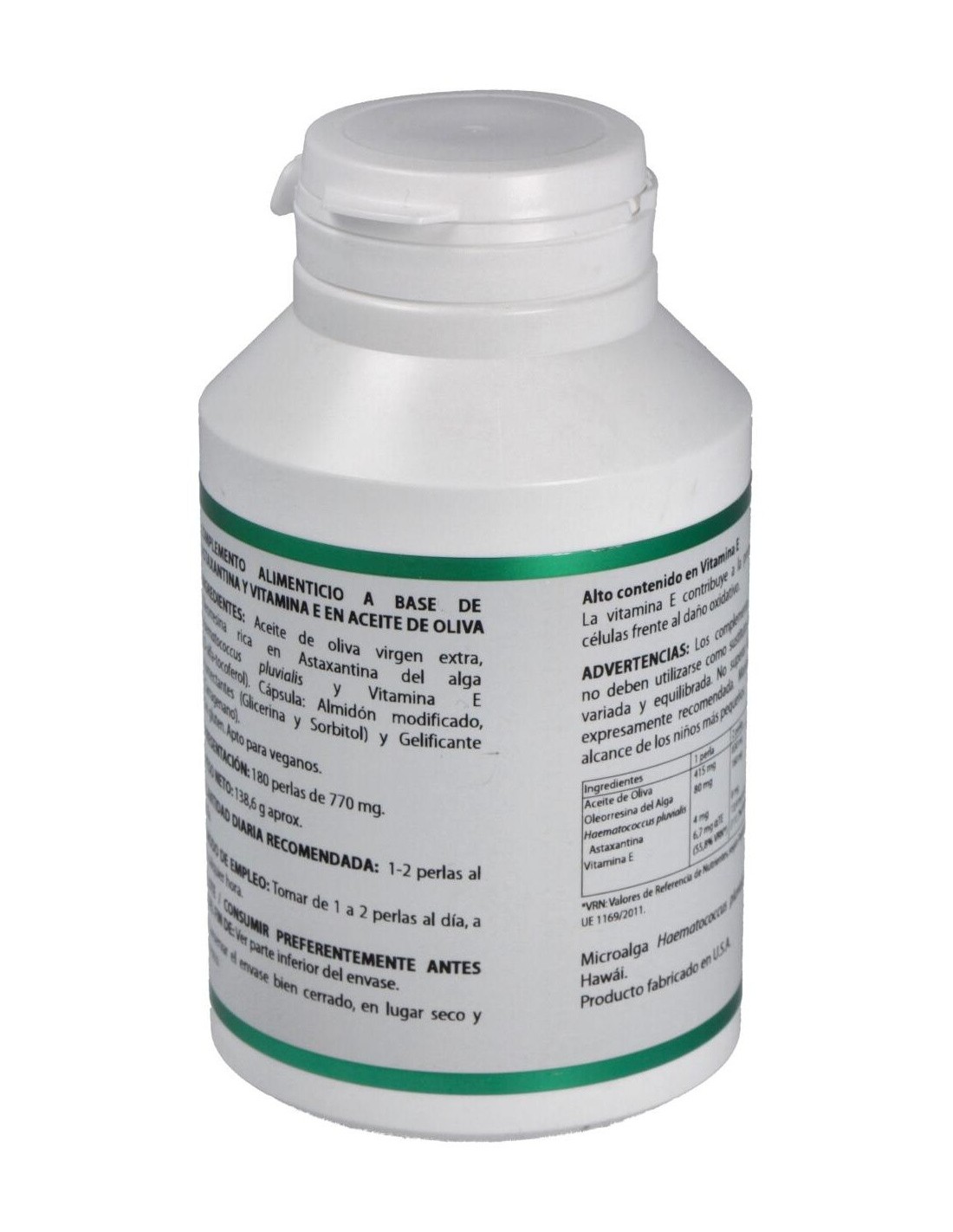 MICROALGA HAEMATOCOCCUS PLUVIALIS, ASTAXANTINA, LUTEÍNA, BETACAROTENO, VITAMINA E NATURAL, ACEITE DE CÁRTAMO ALTO OLEICO.