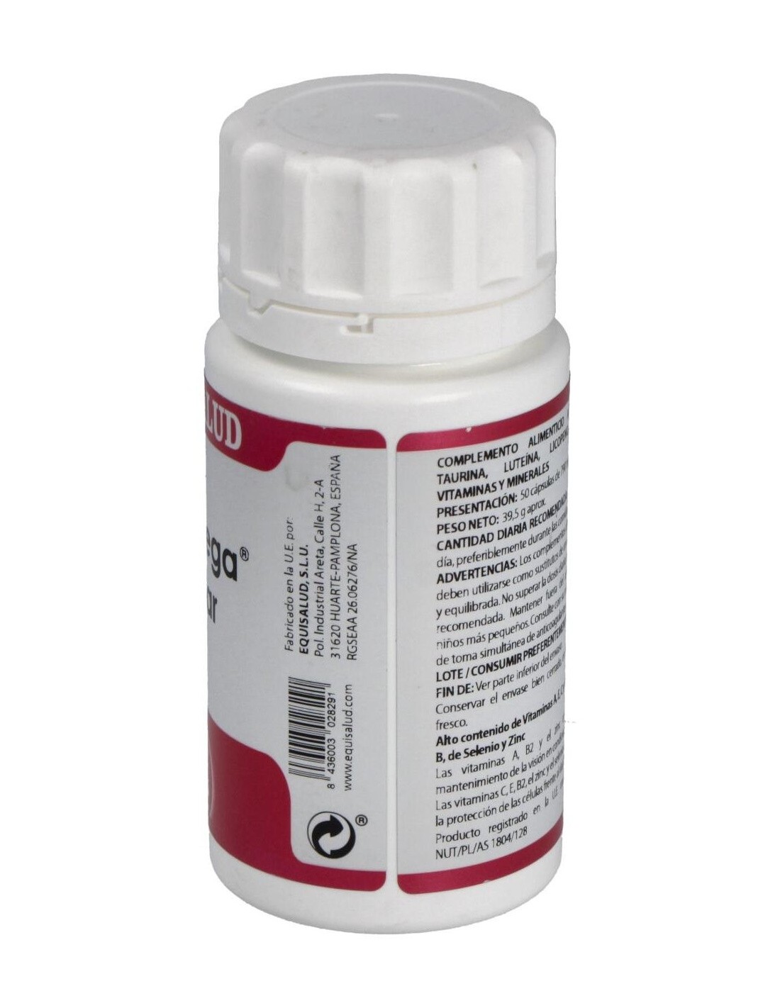 Taurina, 100 mg: complejo B (vitaminas: B1 (clorhidrato de tiamina), B2 (riboflavina), niacina (nicotinamida), ácido pantoténico (D-pantotenato cálcico), B6 (clorhidrato de piridoxina), folato (ácido pteroilmonoglutámico), B12 (cianocobalamina) y biotina (D-biotina)) en levadura de cerveza, 100 mg: arándano extracto seco (Vaccinium myrtillus L.), 50 mg: ginkgo extracto seco (Ginkgo biloba L.), 45 mg: vitamina C (ascorbato cálcico), 37,2 mg: gluconato de zinc (14,35% zinc), 30 mg: complejo de bioflavonoides cítricos (>50% flavonoides totales), 25 mg: levadura enriquecida con selenio (selenio 1.000 ppm), 25 mg (aporta 25 µg de selenio): luteína (>10% luteína), 7 mg: vitamina E (acetato de DL-alfa-tocoferilo), 3,36 mg: pimienta negra extracto seco (Piper nigrum L.), 2 mg: beta-caroteno (>10% beta-caroteno), 2 mg: licopeno (>3% licopeno), 0,3 mg. Envoltura: polisacárido de origen vegetal (pululano).