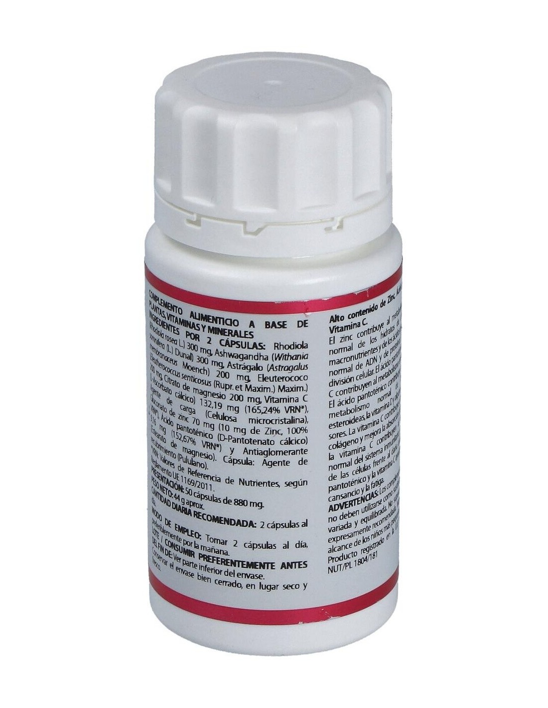 RHODIOLA. ASHWAGANDHA. ASTRÁGALO. ELEUTEROCOCO VITAMINA C. ZINC. ÁCIDO PANTOTÉNICO. MAGNESIO.