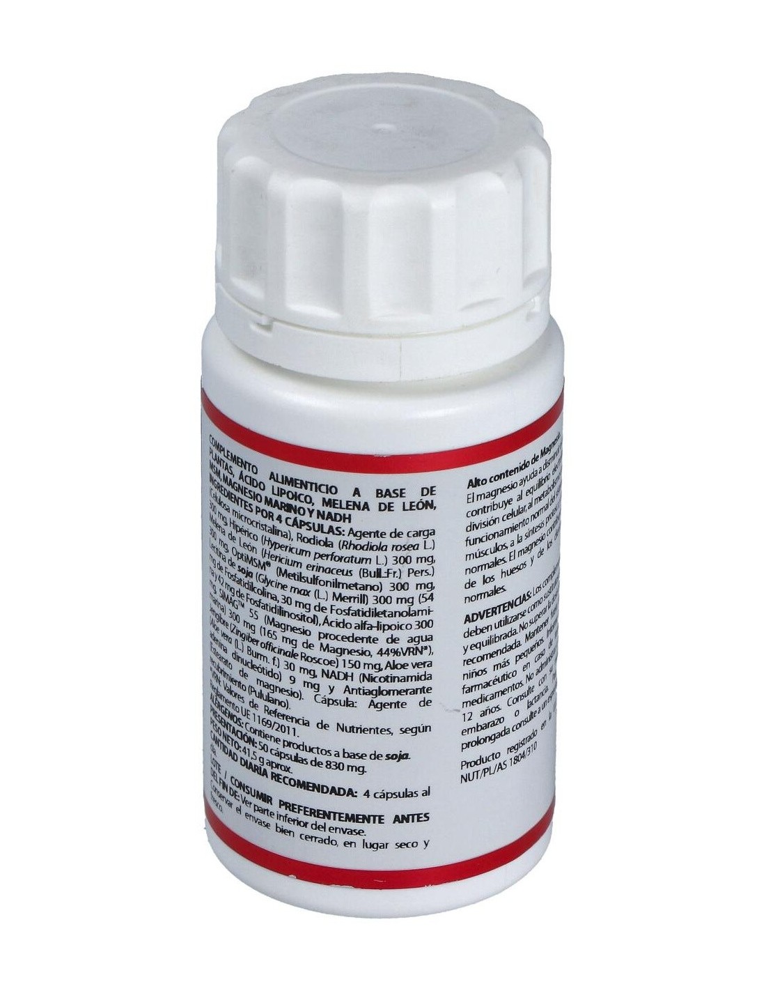 Rodiola, Hipérico, Melena de León, OptiMSM, Lecitina de soja, Ácido alfa-lipoico, SIMAGTM 55, Jengibre, Aloe vera, NADH, Celulosa microcristalina, Estearato de magnesio. Envoltura de polisacárido de origen vegetal (pululano).