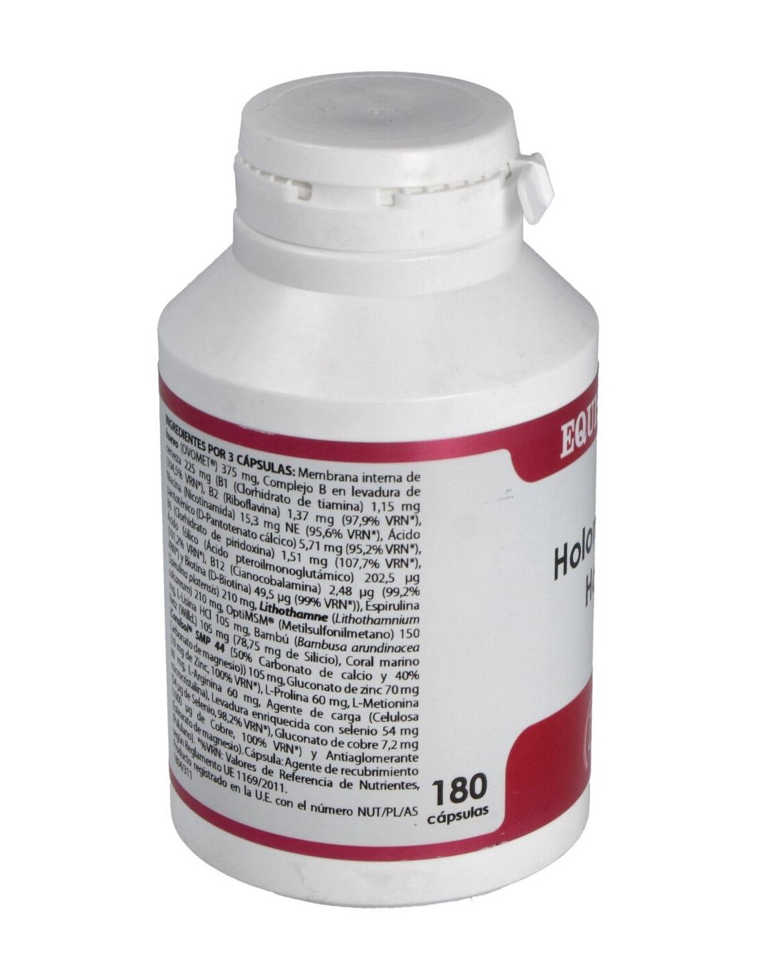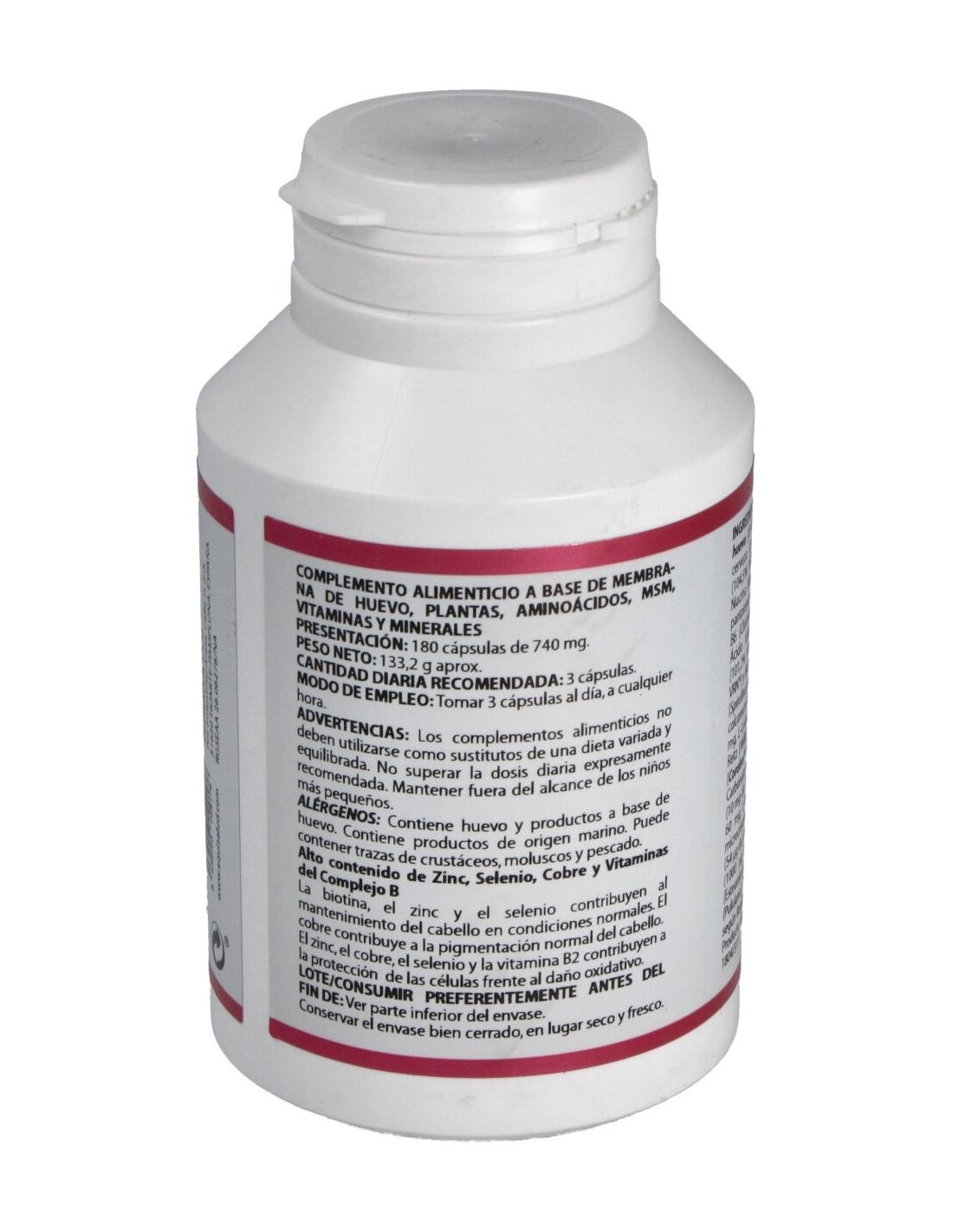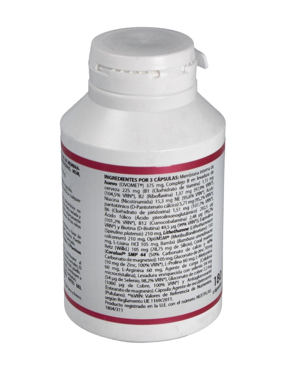 MEMBRANA INTERNA DE HUEVO (OVOMET®), 125 MG; COMPLEJO B EN LEVADURA DE CERVEZA, 75 MG; ESPIRULINA (SPIRULINA PLATENSIS), 70 MG; LITHOTHAMNE (LITHOTHAMNIUM CALCAREUM), 70 MG; OPTIMSM (METILSULFONILMETANO) 50 MG, L-LISINA HCL 35 MG, BAMBÚ (BAMBUSA ARUNDINACEA RETZ (WILLD.), 35 MG; CORAL MARINO (CORALSOL® SMP 44 (50% CARBONATO DE CALCIO Y 40% CARBONATO DE MAGNESIO)), 35 MG; GLUCONATO DE ZINC, 23,3 MG; L-PROLINA, 20 MG; L-METIONINA, 20 MG; L-ARGININA, 20 MG; LEVADURA ENRIQUECIDA CON SELENIO, 18 MG; GLUCONATO DE COBRE, 2,4 MG.