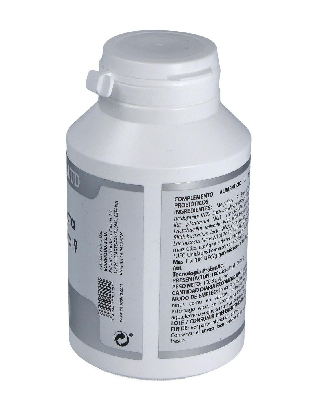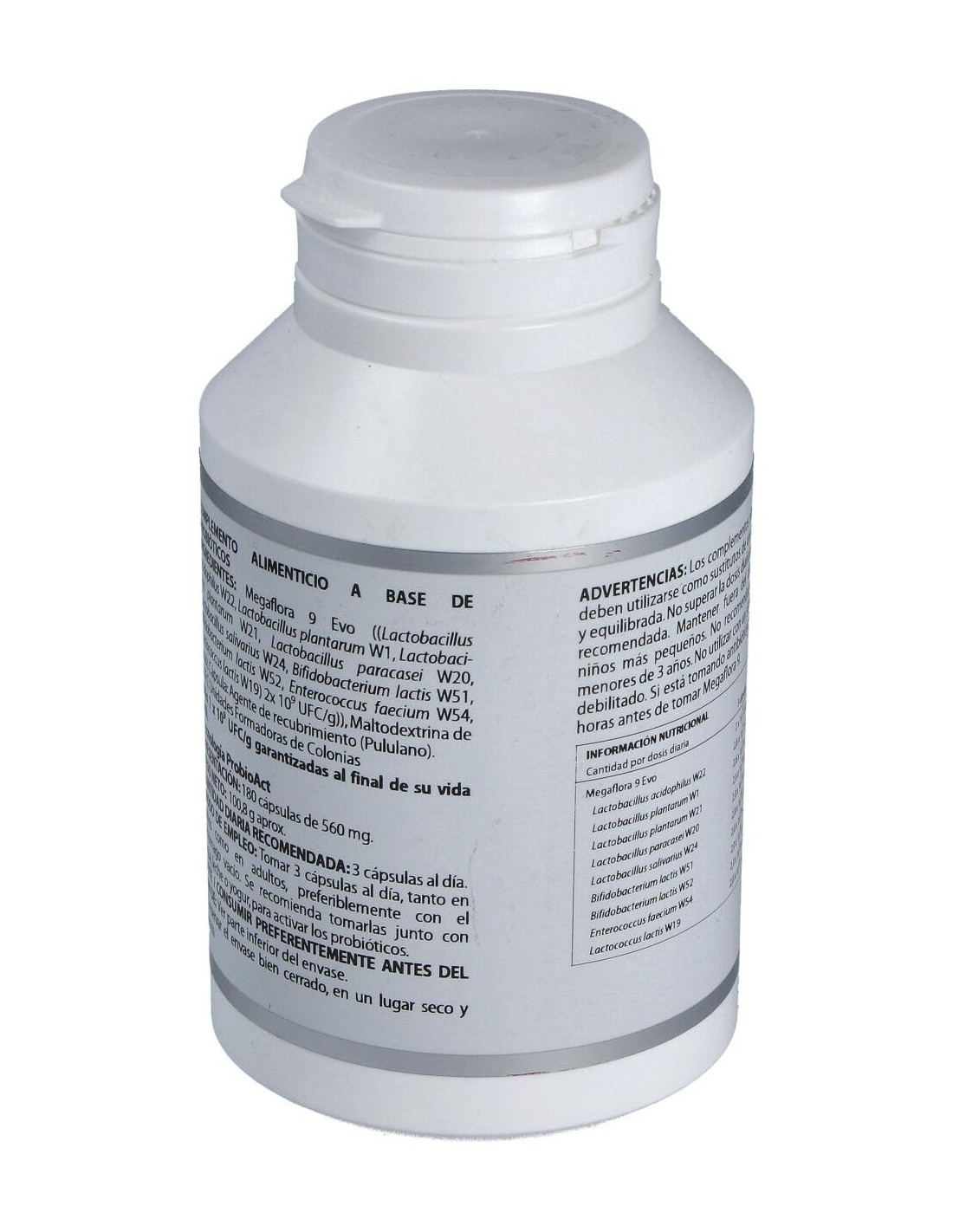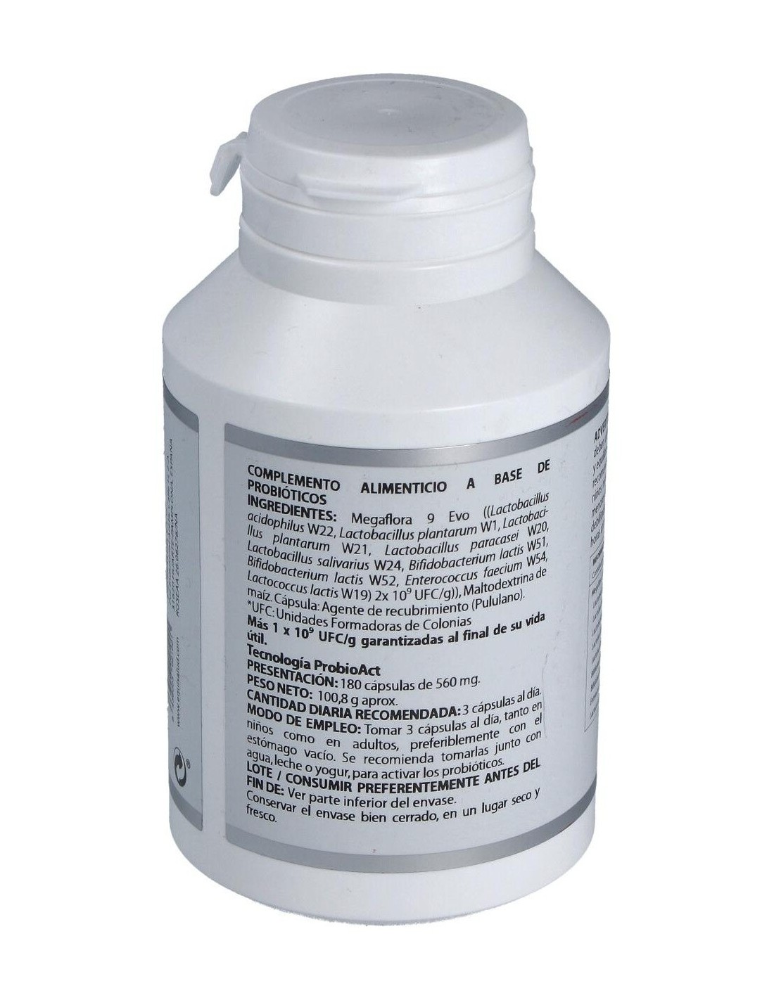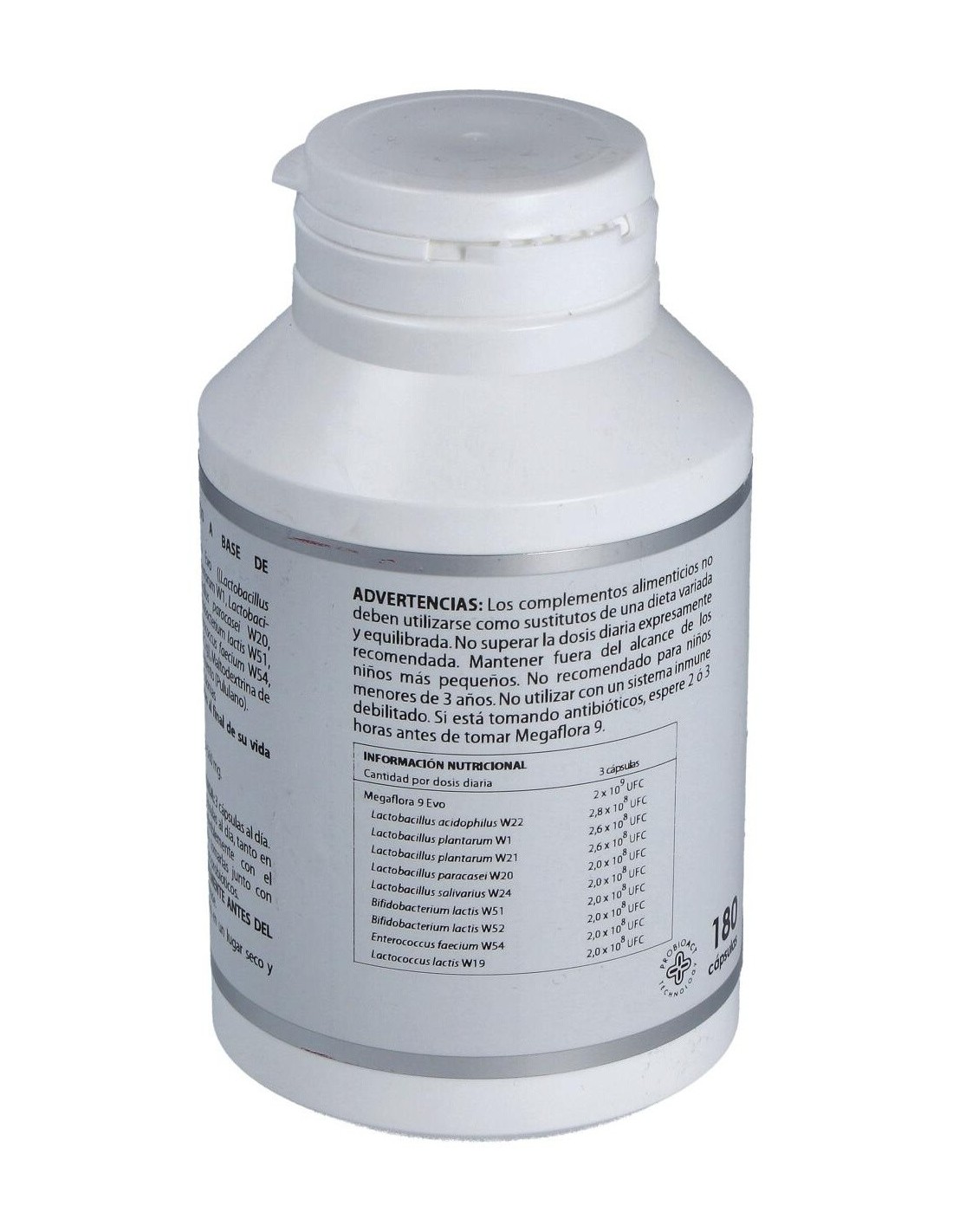 Megaflora 9® ((Bifidobacterium lactis W51, Bifidobacterium lactis W52, Enterococcus faecium W54, Lactobacillus acidophilus W22, Lactobacillus paracasei W20, Lactobacillus plantarum W21, Lactobacillus salivarius W24, Lactococcus lactis W19) 1x109 UFC/g), 990 mg. Excipiente tecnológico: maltodextrina de maíz (agente de carga). Envoltura: agente de recubrimiento (hidroxipropilmetilcelulosa) y gelificante (goma gellan).