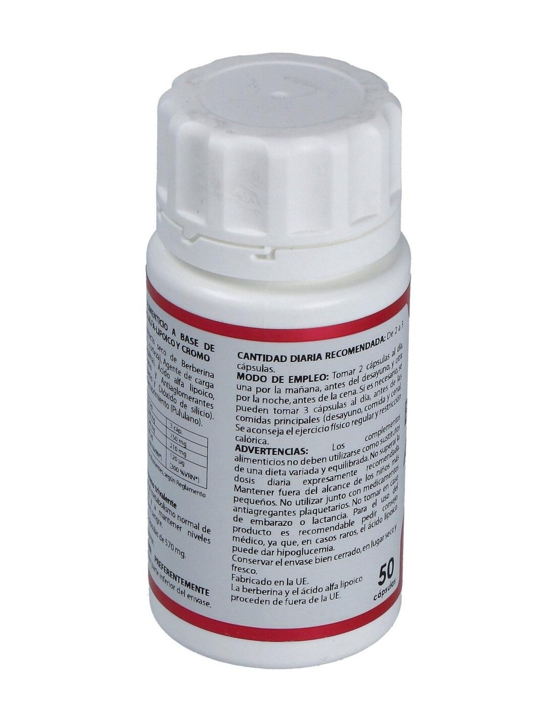 Berberina extracto seco (Berberis aristata DC.), 250 mg: ácido alfa-lipoico, 70 mg: picolinato de cromo (12,3% cromo), 40 µg. Envoltura: polisacárido de origen vegetal (pululano).