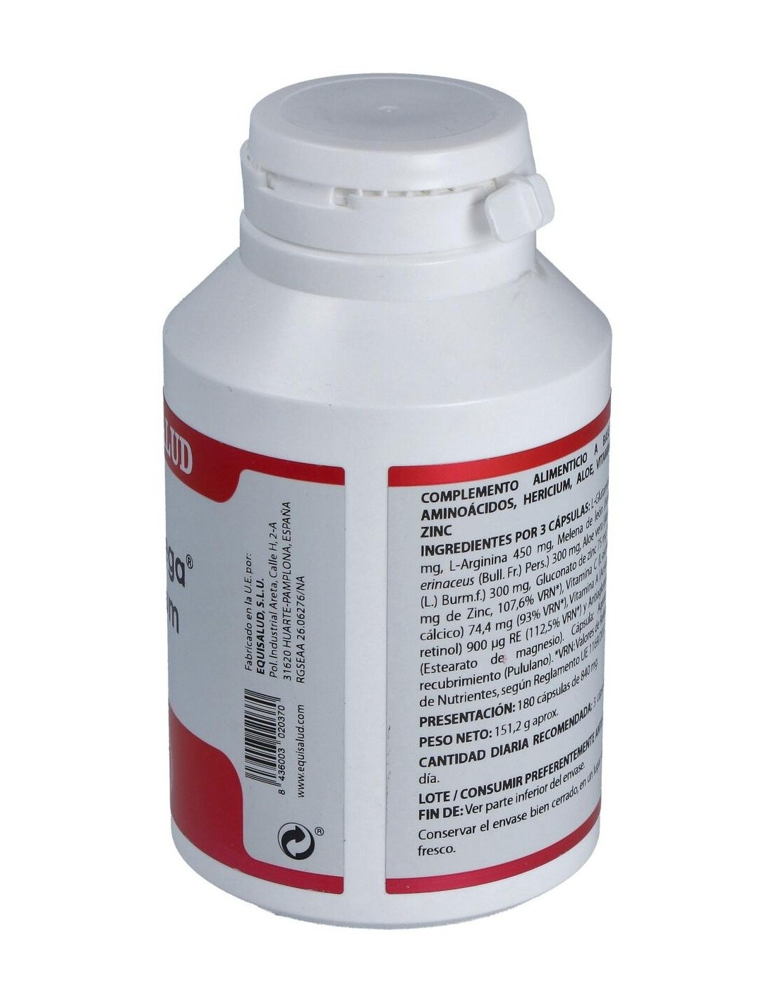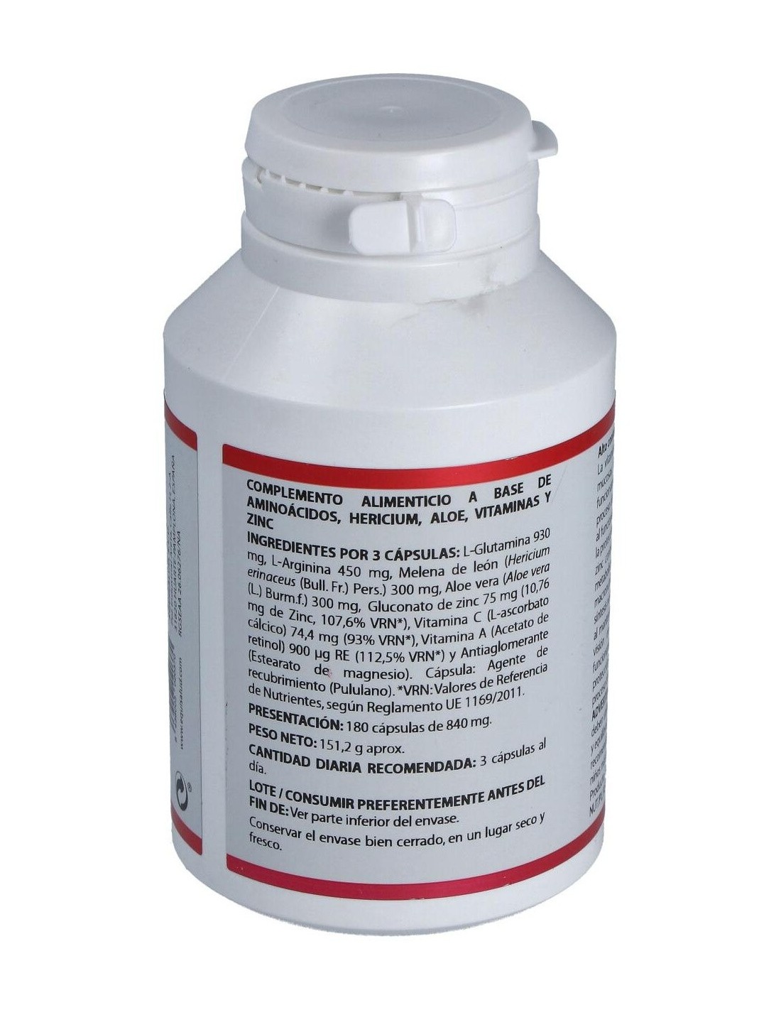 Aloe vera, Estearato de magnesio c.s. Gluconato de Zinc, L-arginina, L-glutamina, Melena de león (Hericium erinaceus), Vitamina A (Retinol), Vitamina C. Envoltura de poliscárido de origen vegetal (pululano)