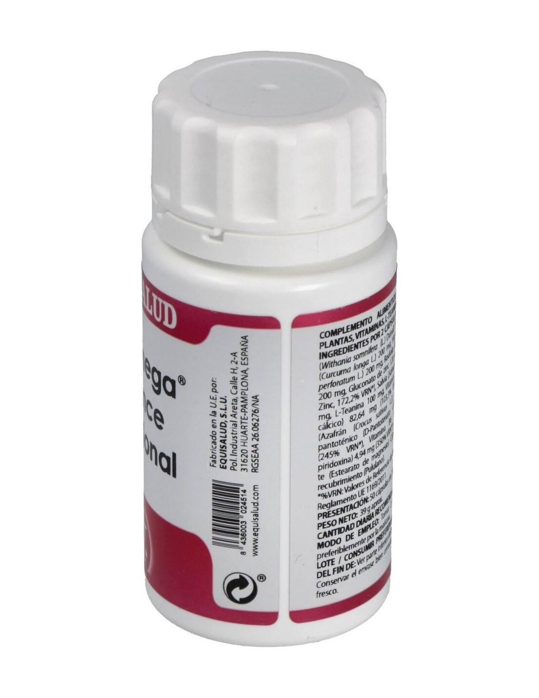 ASHWAGANDHA EXTRACTO SECO (WITHANIA SOMNIFERA (L.) DUNAL), 100 MG; CÚRCUMA EXTRACTO SECO (CURCUMA LONGA L.), 100 MG; HIPÉRICO EXTRACTO SECO (HYPERICUM PERFORATUM L.), 100 MG; RODIOLA EXTRACTO SECO (RHODIOLA ROSEA L.), 100 MG; GLUCONATO DE ZINC (14,35% ZINC), 60 MG; SALVIA EXTRACTO SECO (SALVIA OFFICINALIS L.), 50 MG; L-TEANINA, 50 MG; ÁCIDO ASCÓRBICO (ASCORBATO CÁLCICO), 41,32 MG; AZAFRÁN EXTRACTO SECO SAFFR'ACTIV® (CROCUS SATIVUS L.), 30 MG; ÁCIDO PANTOTÉNICO (D-PANTOTENATO CÁLCICO), 7,35 MG; VITAMINA B6 (PIRIDOXINA CLORHIDRATO), 2,47 MG. EXCIPIENTES TECNOLÓGICOS: ESTEARATO DE MAGNESIO (ANTIAGLOMERANTE), C.S.