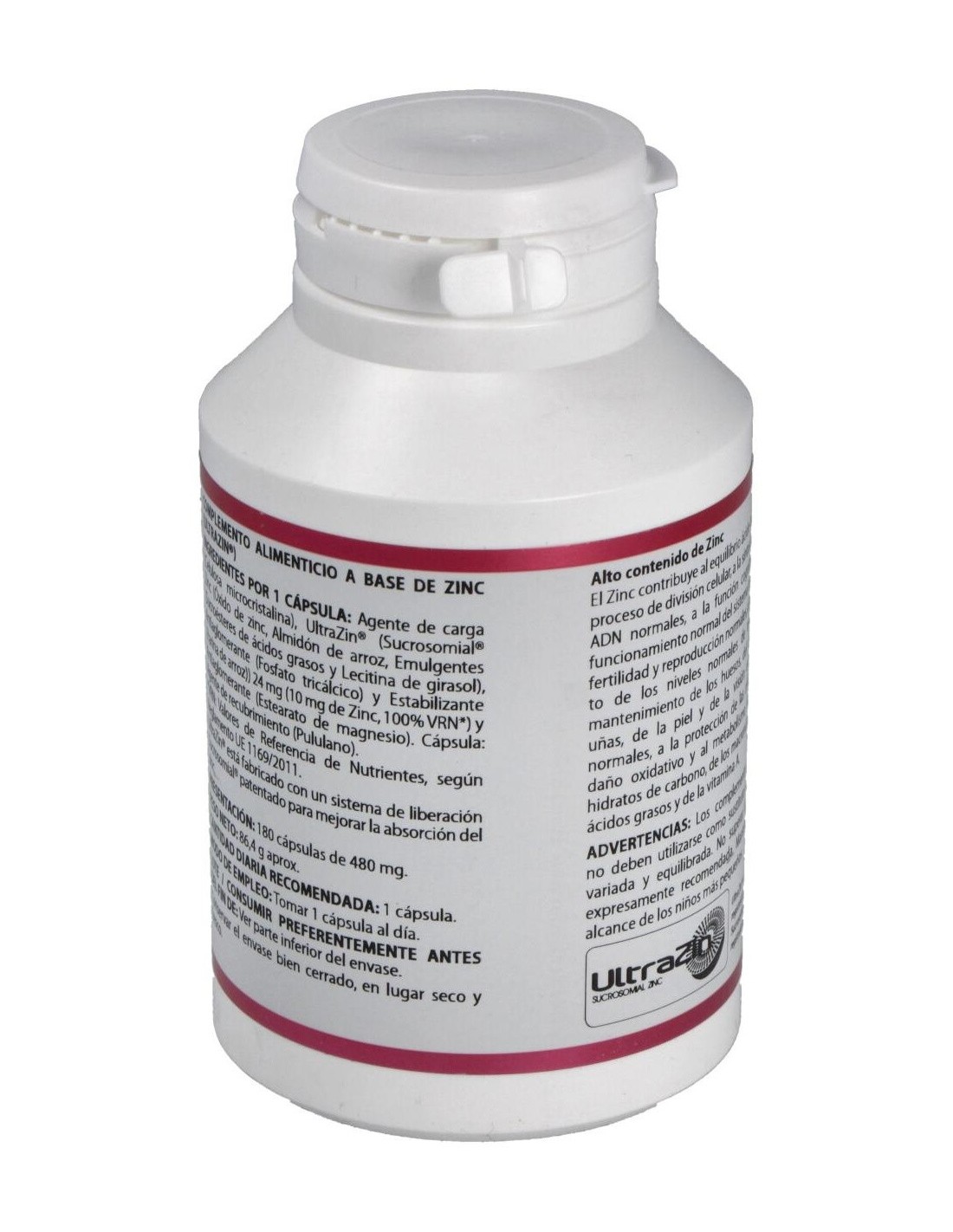 ULTRAZIN* (SUCROSOMIAL® ZINC, ZINC LIPOSOMADO, 42-52 % ZINC), 24 MG. EXCIPIENTE TECNOLÓGICO: CELULOSA MICROCRISTALINA (AGENTE DE CARGA), C.S. Y ESTEARATO DE MAGNESIO (ANTIAGLOMERANTE), C.S. ENVOLTURA: POLISACÁRIDO DE ORIGEN VEGETAL (PULULANO).