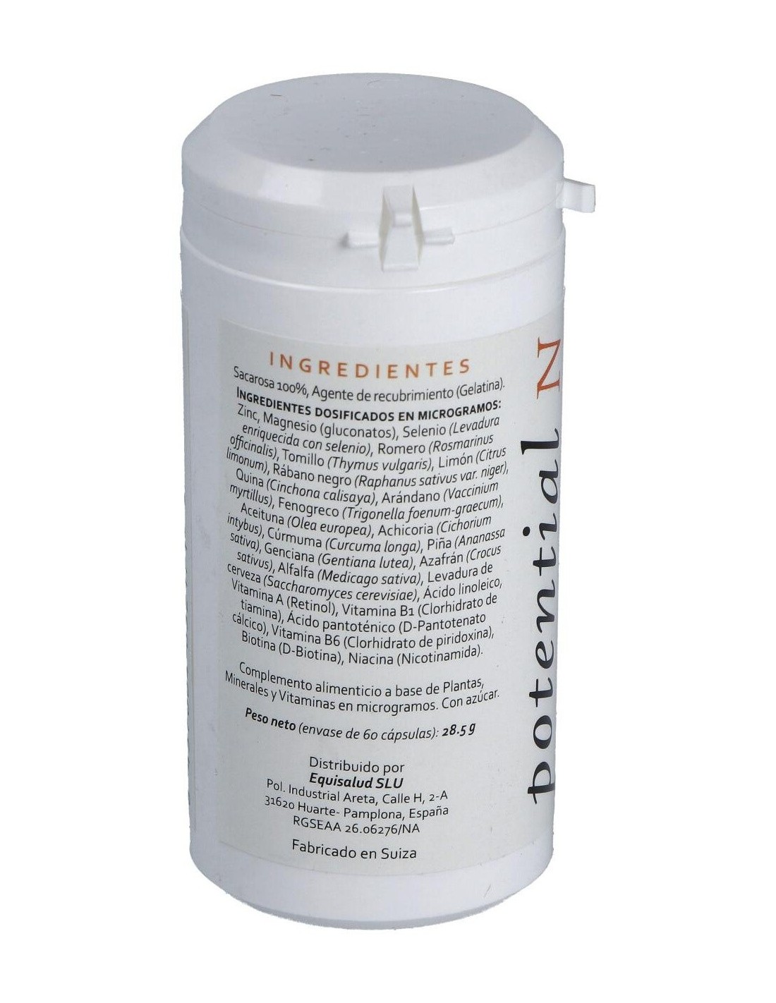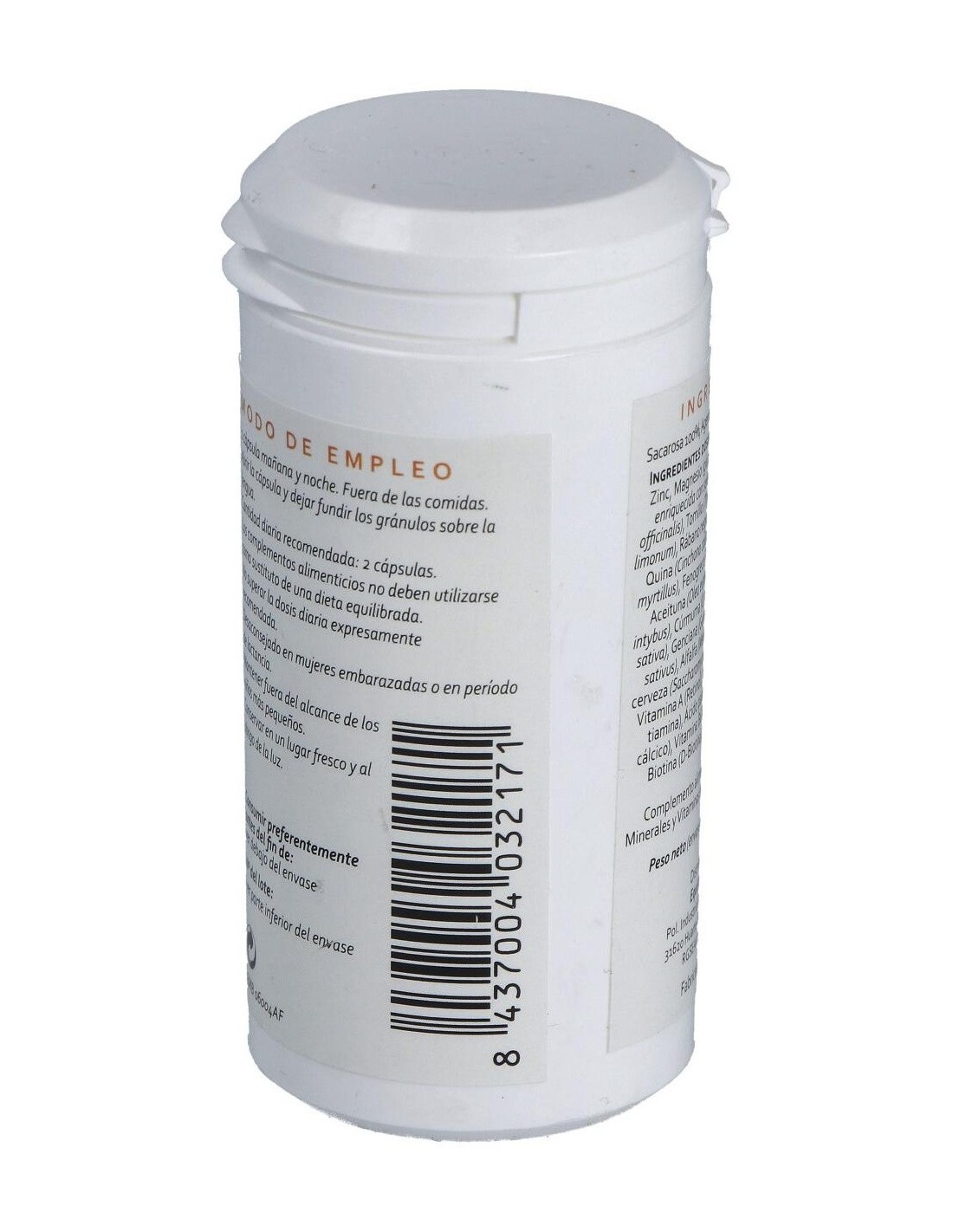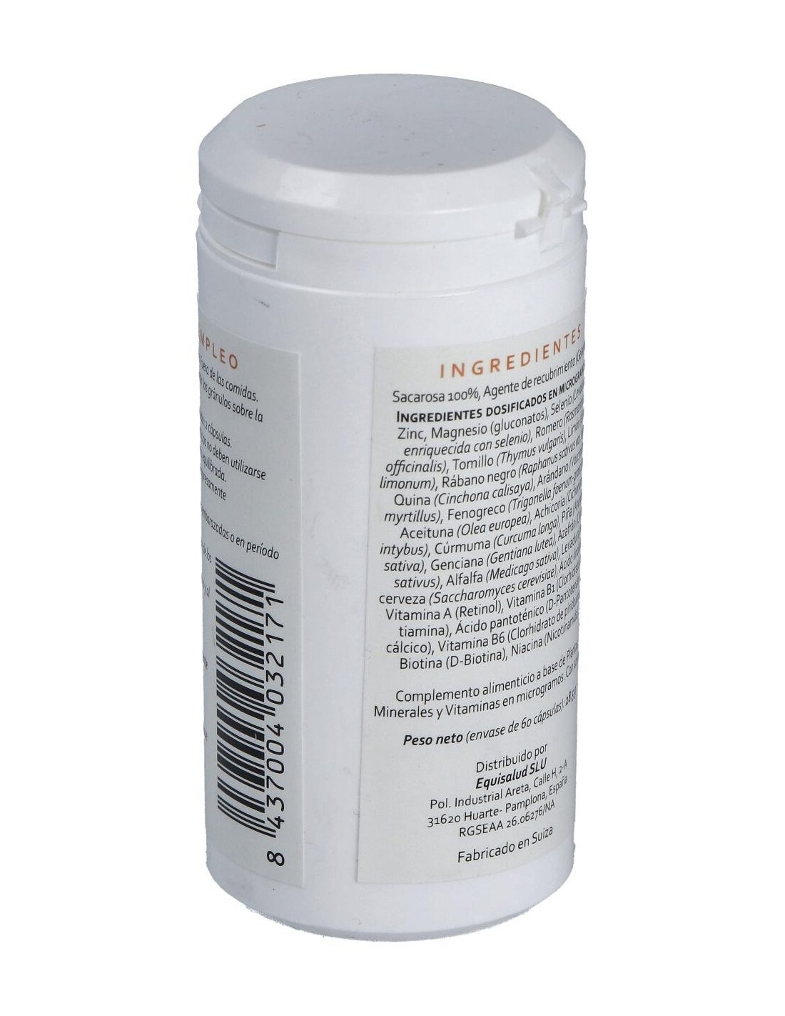 Zinc, Magnesio (gluconatos), Selenio (Levadura enriquecida con selenio). Romero (Rosmarinus officinalis), Tomillo (Thymus vulgaris), Limón (Citrus limonum), Rábano negro (Raphanus sativus var. Niger), Quina (Cinchona calisaya), Arándano (Vaccinium myrtillus), Fenogreco (Trigonella foenum-graecum), Aceituna (Olea europea), Achicoria (Cichoruum intybus), Cúrcuma (Curcuma longa), Piña (Ananassa sativa), Genciana (Gentiana lutea), Azafrán (Crocus sativus), Alfalfa (Medicago sativa), Levadura de cerveza (Saccharomyces cerevisiae), Ácido linoleico. Vitamina A (Retinol), Vitamina B1 (Clorhidrato de tiamina), Vitamina B6 (Clorhidrato de piridoxina), Biotina (D-Biotina), Niacina (Nicotinamina) Envoltura: agente de recubrimiento (gelatina), sacarosa 100%.
