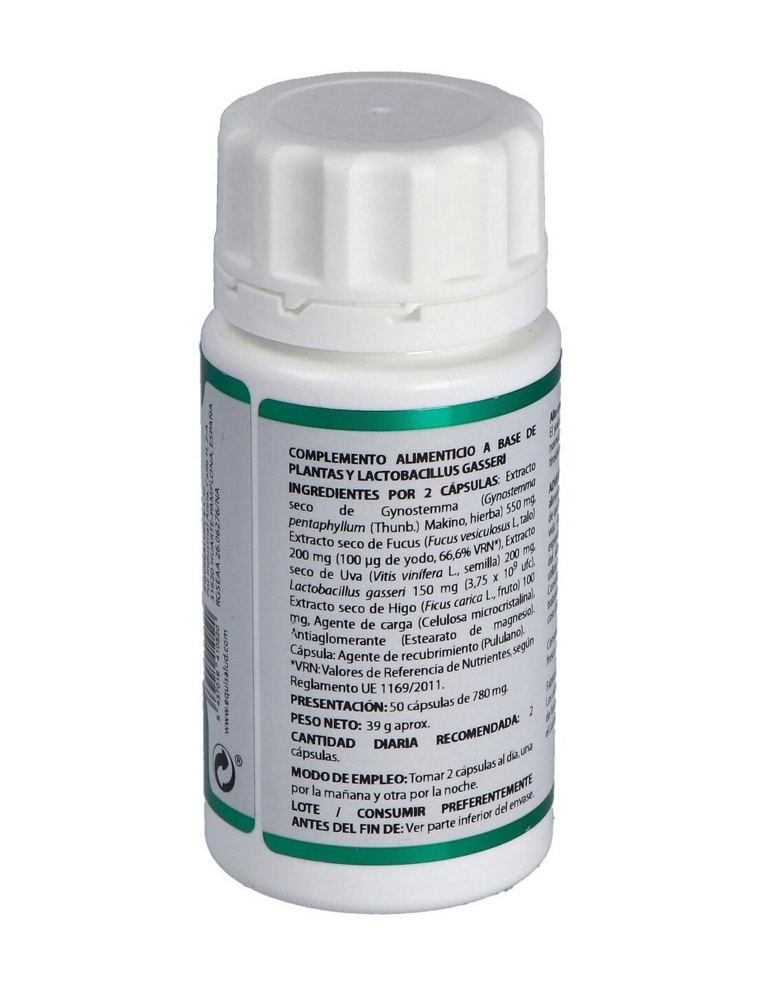Jiaogulan* extracto seco (Gynostemma pentaphyllum (Thunb.) Makino), 275 mg: fucus* extracto seco (Fucus vesiculosus L.), 100 mg: uva* (Vitis vinifera L.), 100 mg: Lactobacillus gasseri* (en maltodextrina de maíz, 2,5×10(10) UFC/g), 75 mg: higo* (Ficus carica L.), 50 mg. Envoltura: polisacárido de origen vegetal (pululano).