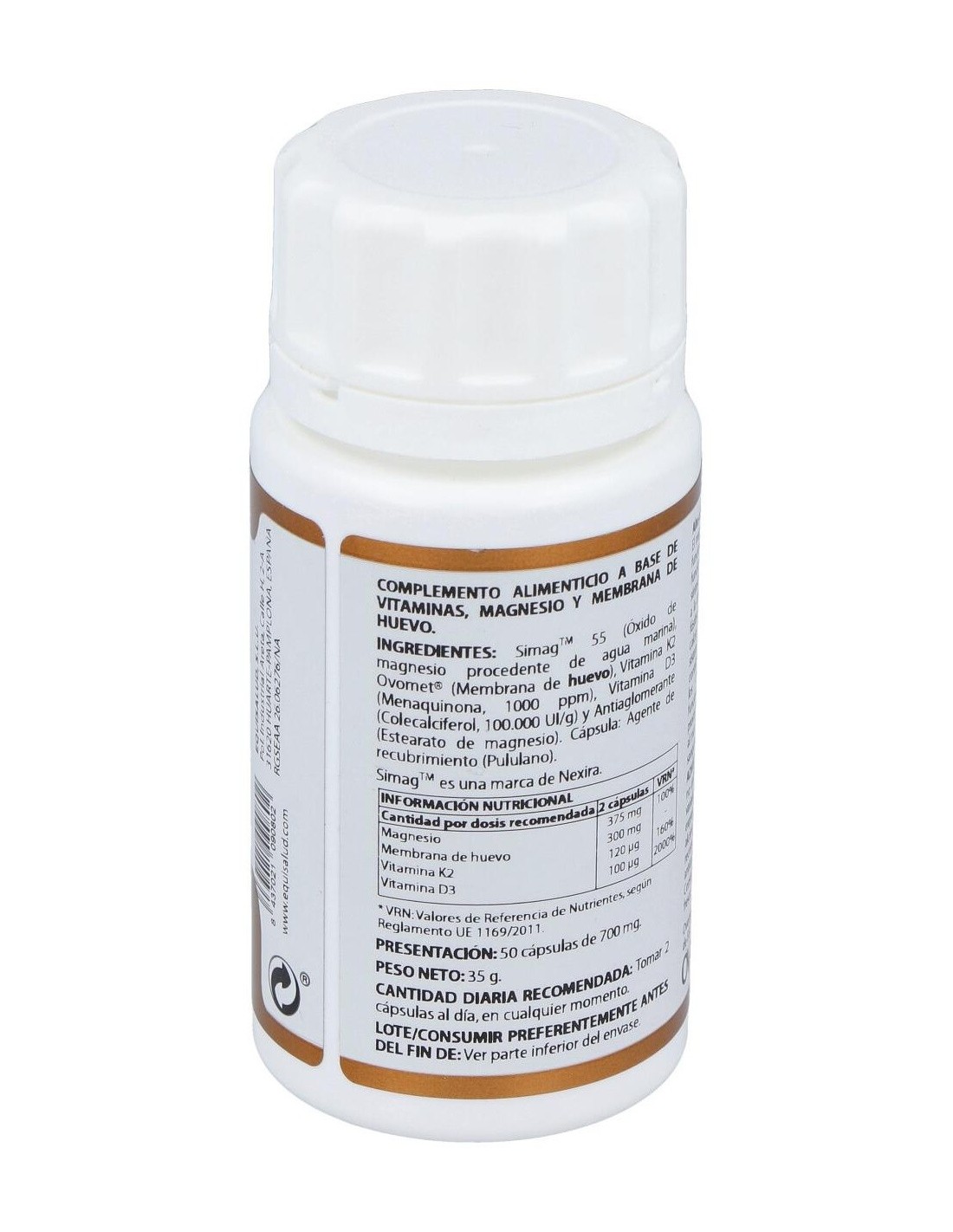 Complemento alimenticio en cápsulas que está especialmente ideado para ayudar al mantenimiento normal de los huesos, gracias a su compuesto formulado a base de magnesio, membrana de huevo, vitamina K2 y vitamina D3. No está recomendado para personas que toman anticoagulantes de cumarina.