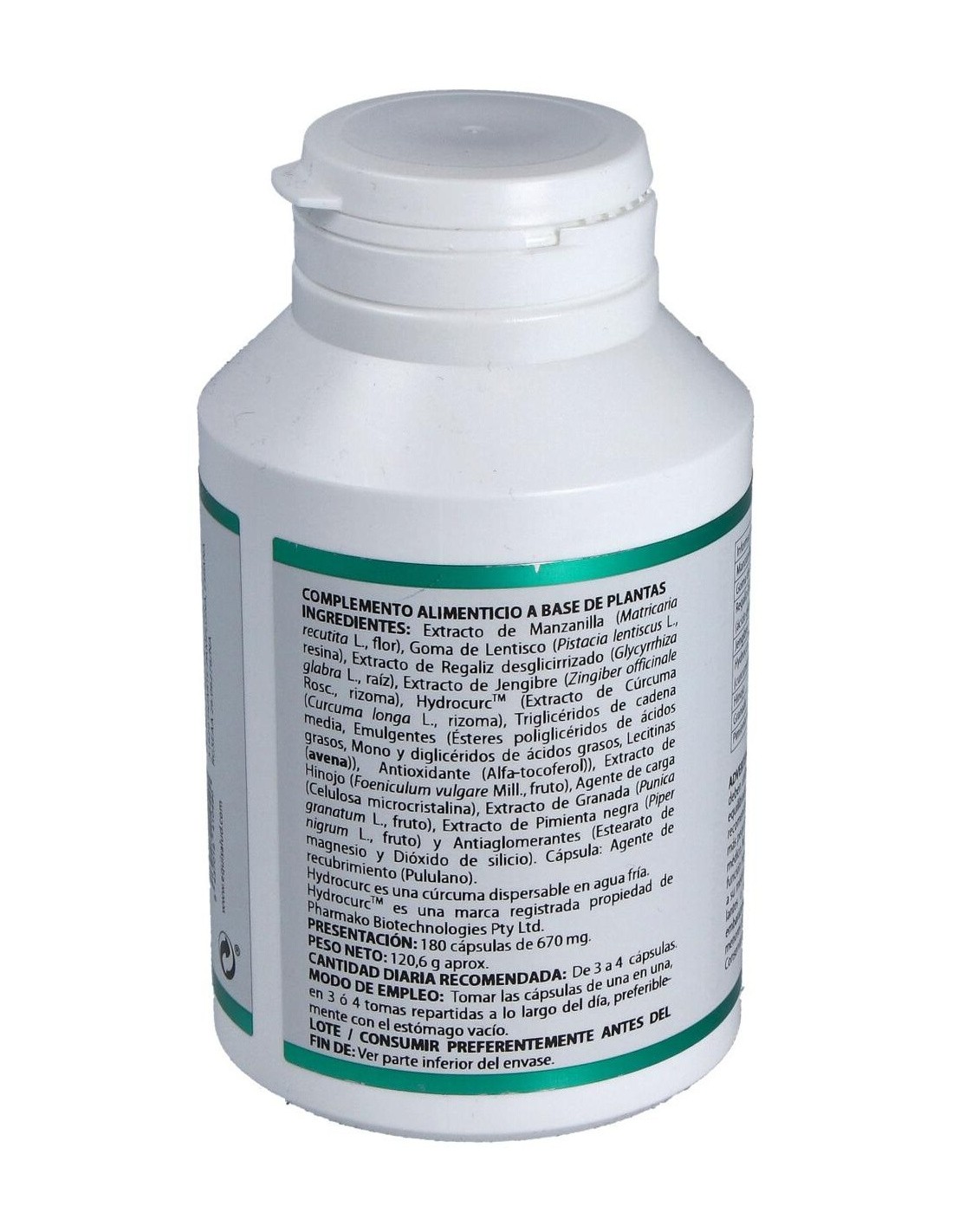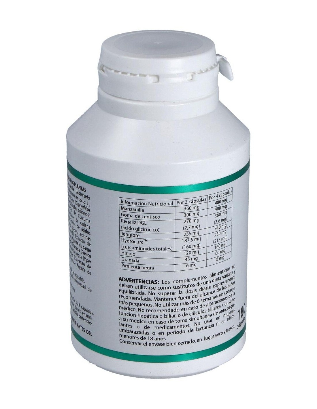 Manzanilla extracto seco (Matricaria recutita L.), 120mg; goma de lentisco (Pistacia lentiscus L.), 100 mg; regaliz desglicirrizado extracto seco (Glycyrrhiza glabra L.), 90 mg; jengibre extracto seco (Zingiber officinale Rosc.), 85 mg; HydroCurcTM (extracto de cúrcuma (Curcuma longa L.), 62,5 mg; hinojo extracto seco (Foeniculum vulgare Mill.), 40 mg; granada extracto seco (Punica granatum L.), 15 mg; pimienta negra extracto seco (Piper nigrum L.), 2 mg. Envoltura: polisacárido de origen vegetal (pululano).