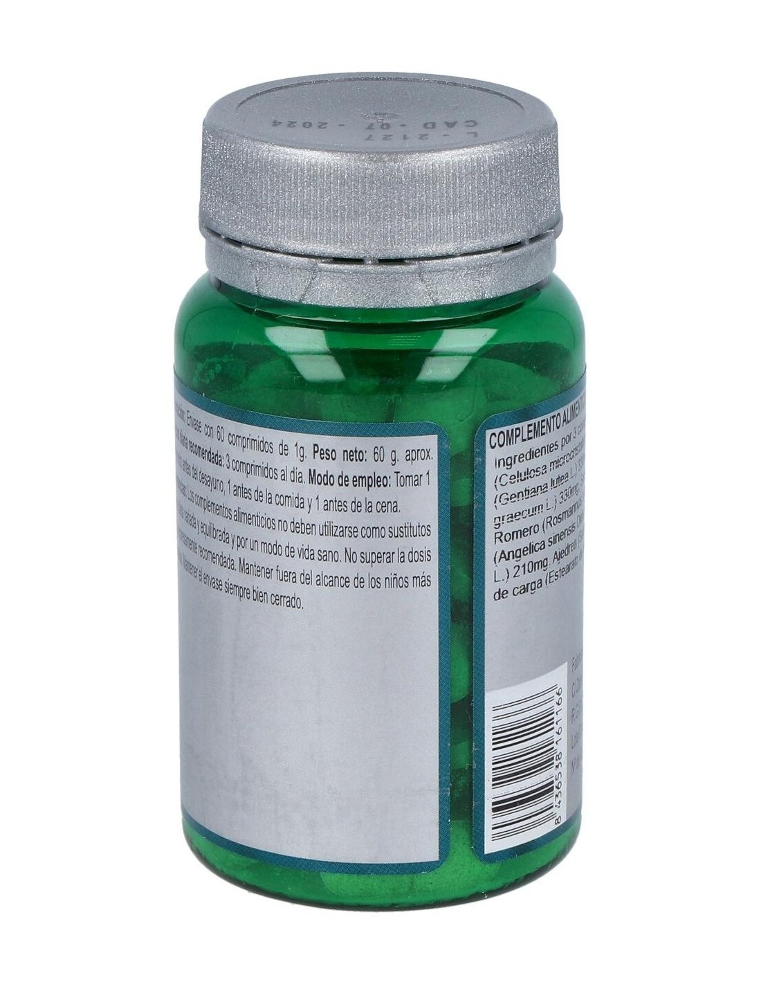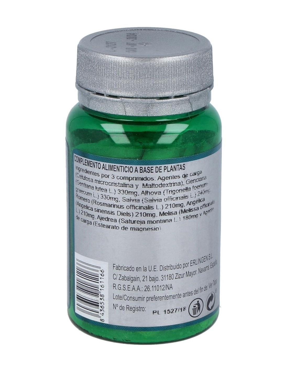 Genciana (Gentiana Lutea L.), Alholva (Trigonella Foenum-Graecum L.), Salvia (Salvia Officinalis L.), Romero (Rosmarinus Officinalis L.), Angélica (Angelica Sinensis Diels), Melisa (Melissa Officinalis L.), Ajedrea (Satureja Montana L.) Y Agentes de Carga (Celulosa Microcristalina, Maltodextrina Y Estearato de Magnesio).