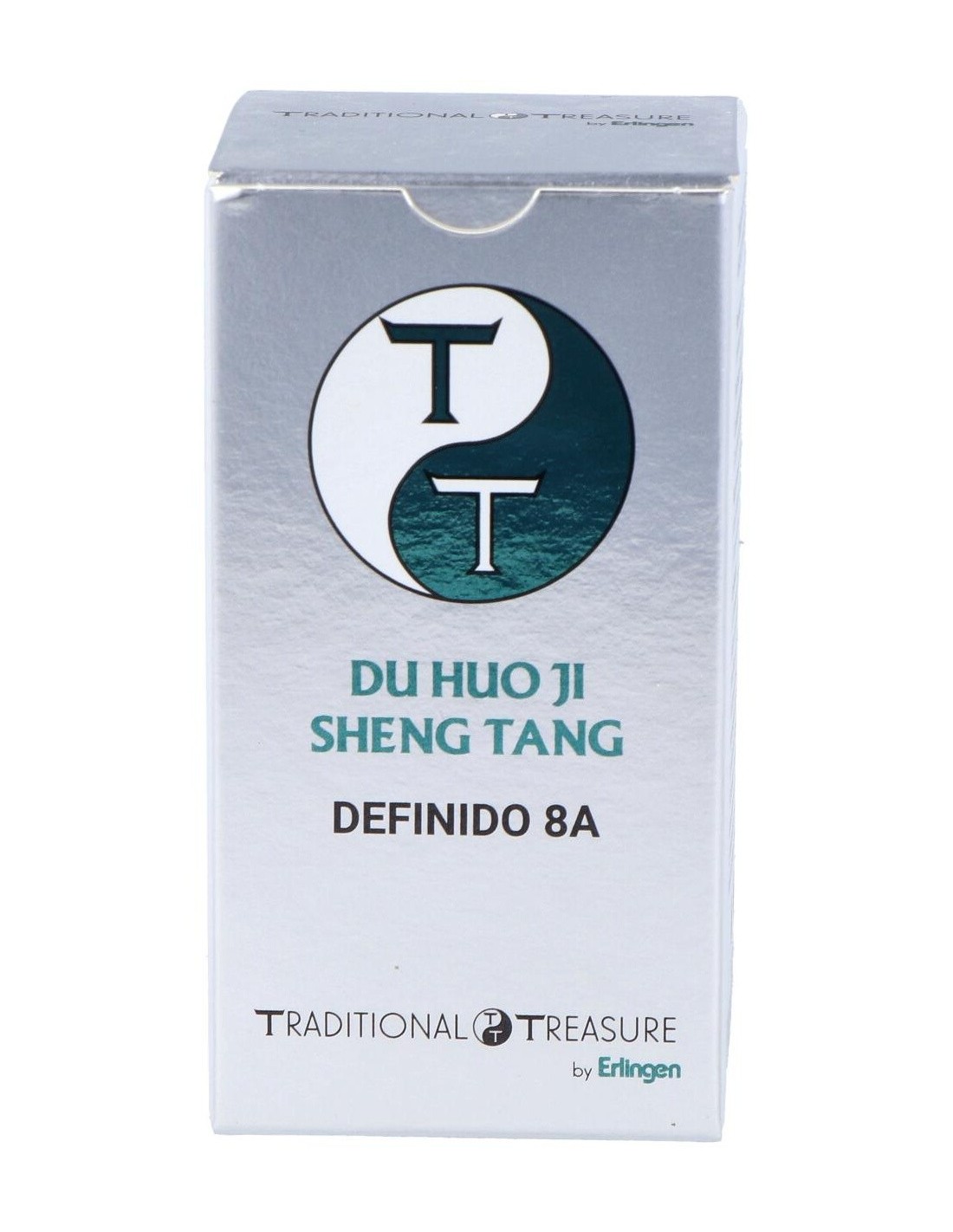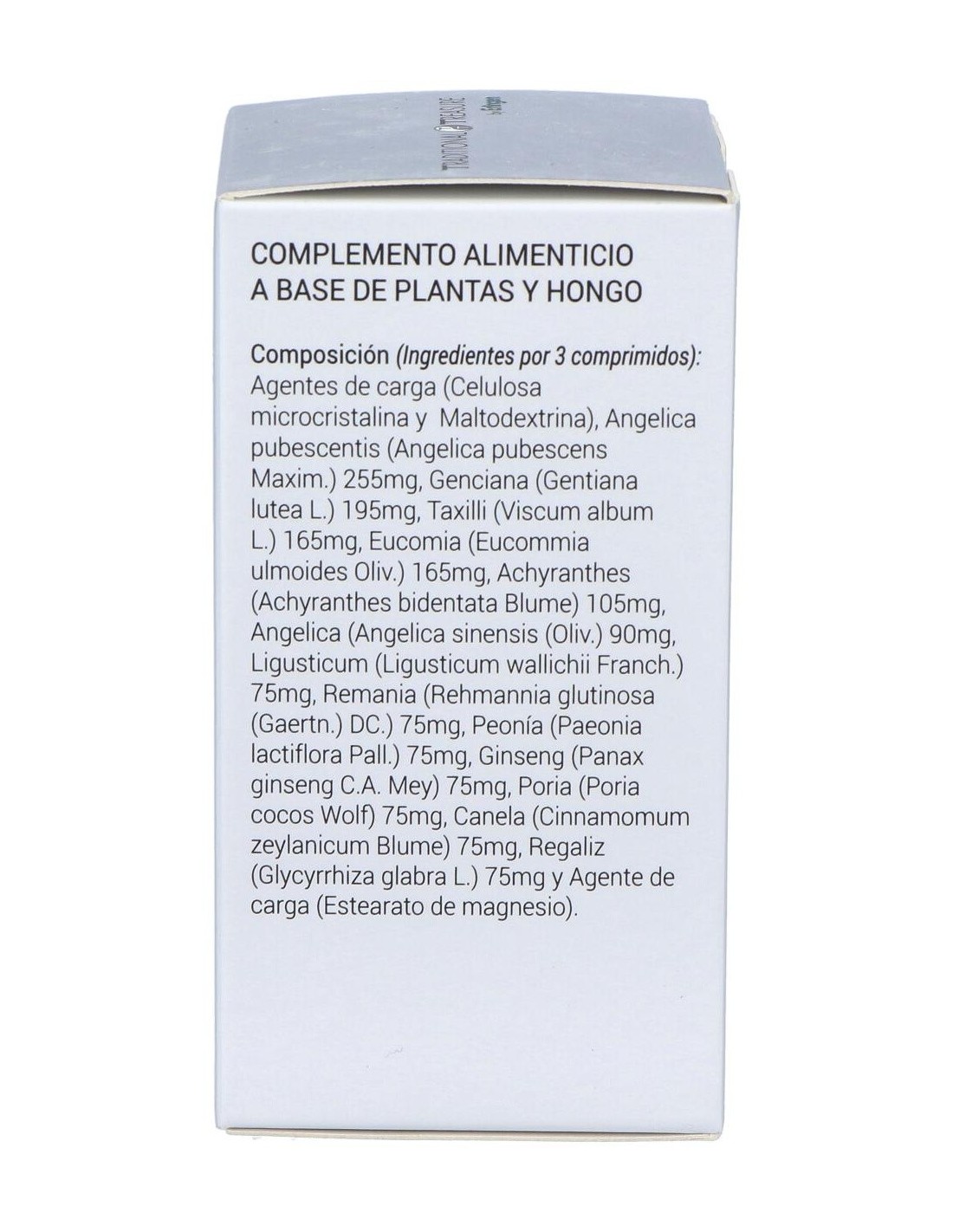 Agentes de carga (Celulosa microcristalina y Maltodextrina), Angelica pubescentis (Angelica pubescens Maxim.) 255 mg, Genciana (Gentiana lutea L.) 195 mg, Taxilli (Viscum album L.) 165 mg, Eucomia (Eucommia ulmoides Oliv.) 165 mg, Achyranthes (Achyranthes bidentata Blume) 105 mg, Angelica (Angelica sinensis (Oliv.) 90 mg, Ligusticum (Ligusticum wallichii Franch.) 75 mg, Remania (Rehmannia glutinosa (Gaertn.) DC.) 75 mg, Peonía (Paeonia lactiflora Pall.) 75 mg, Ginseng (Panax ginseng C.A. Mey) 75 mg, Poria (Poria cocos Wolf) 75 mg, Canela (Cinnamomum zeylanicum Blume) 75 mg, Regaliz (Glycyrrhiza glabra L.) 75 mg y Agente de carga (Estearato de magnesio).