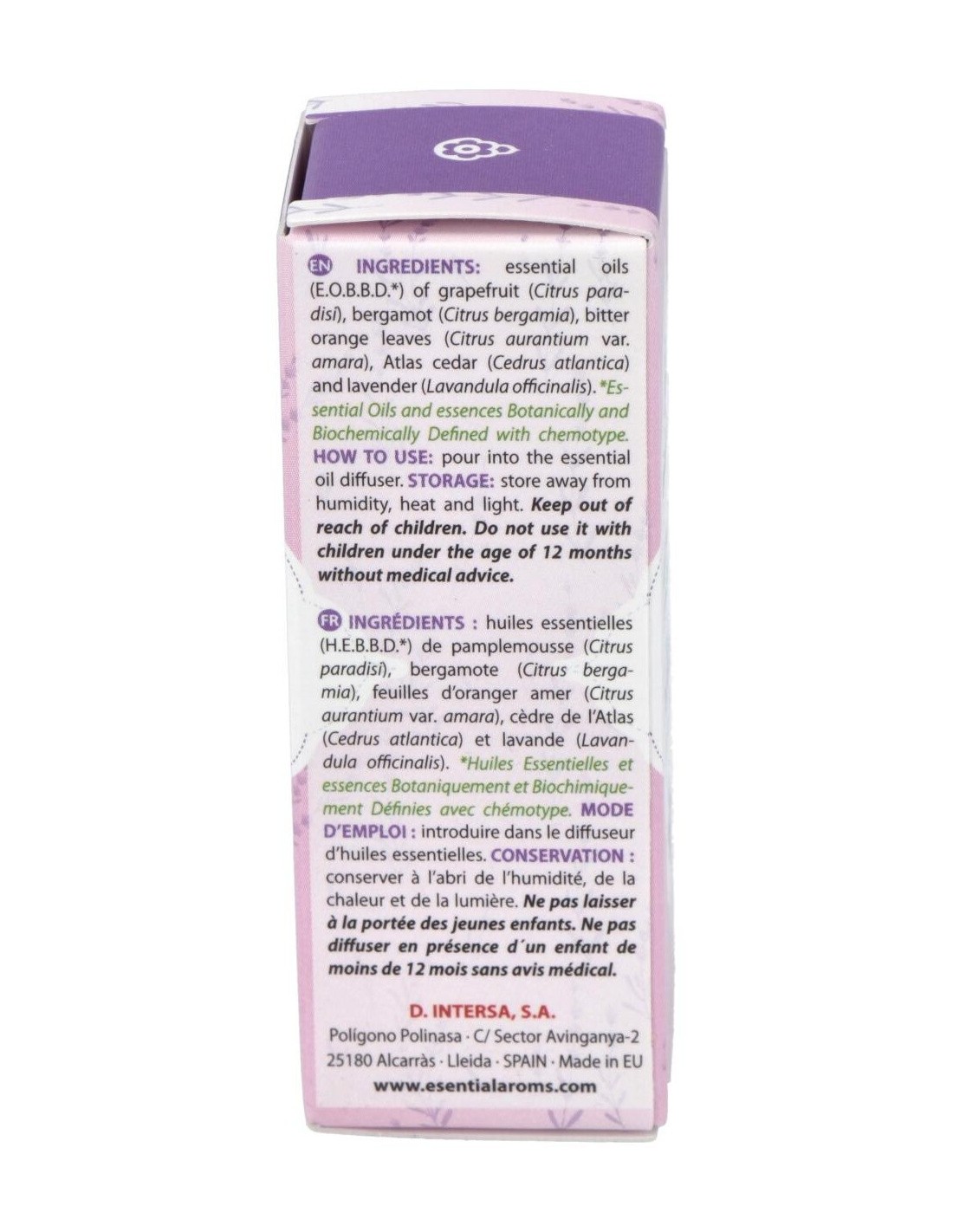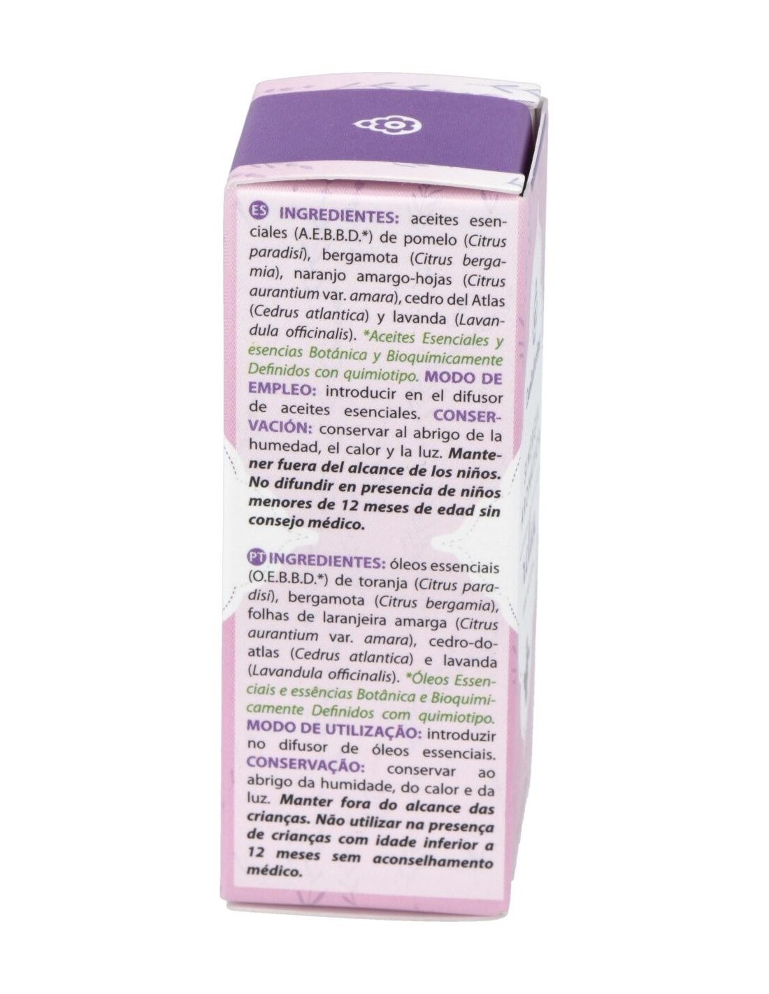 Aceites esenciales A.E.B.B.D.* de: pomelo (Citrus paradisi): bergamota (Citrus bergamia): naranjo amargo-hojas (Citrus aurantium var. amara): cedro del Atlas (Cedrus atlantica): lavanda o espliego (Lavandula officinalis).
