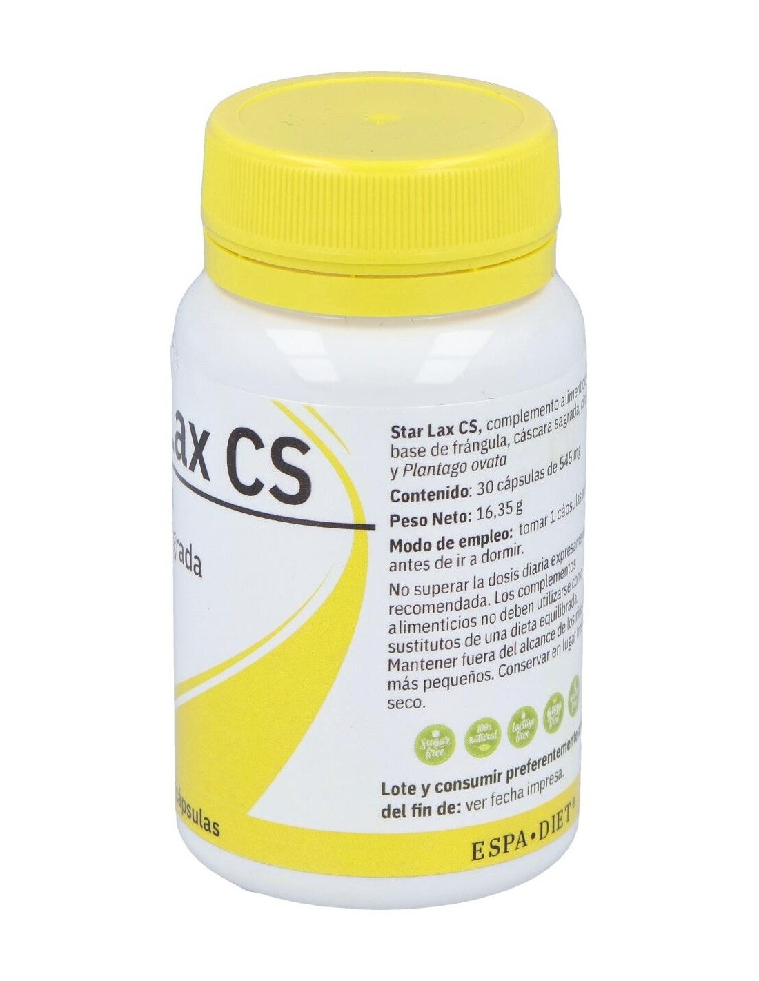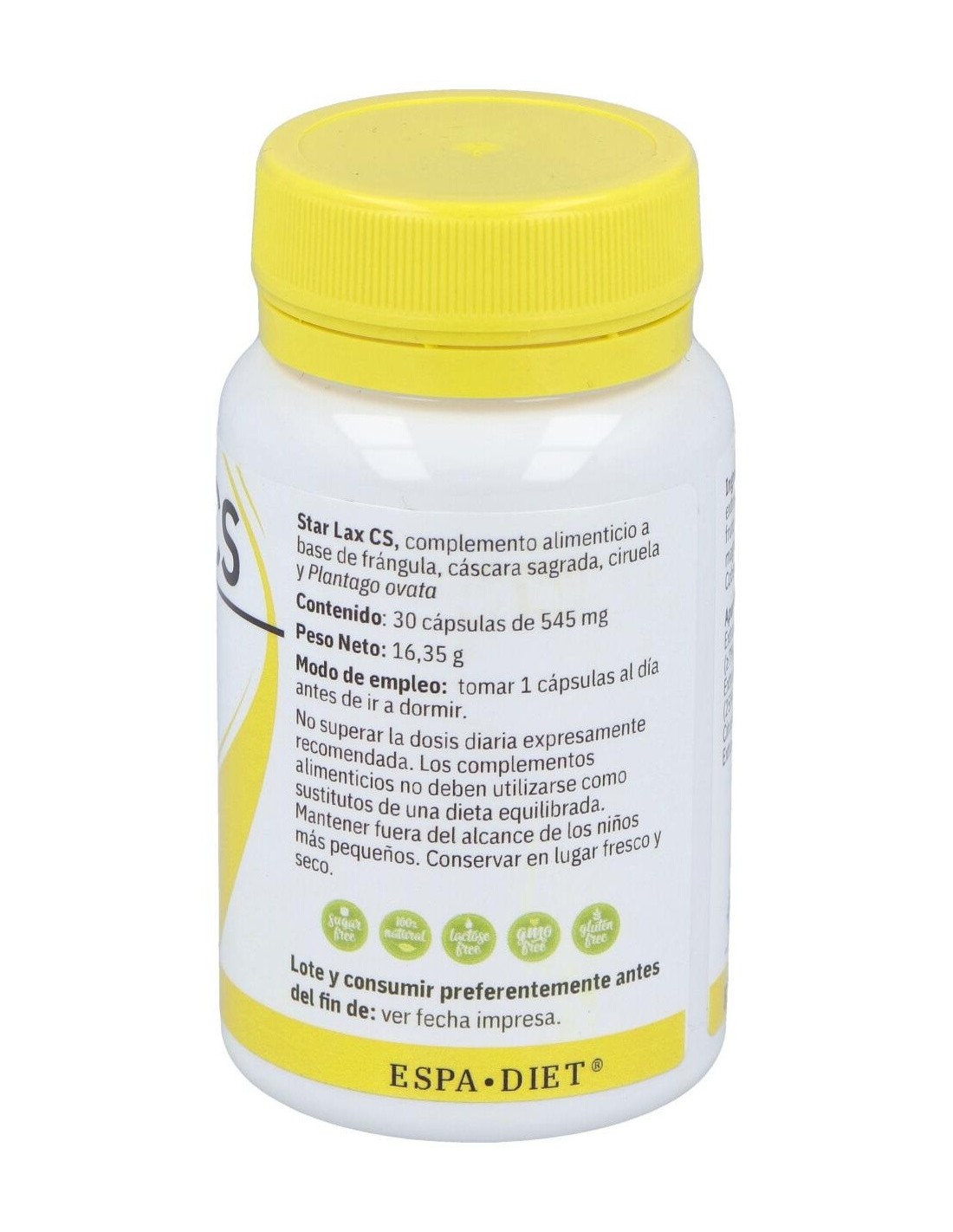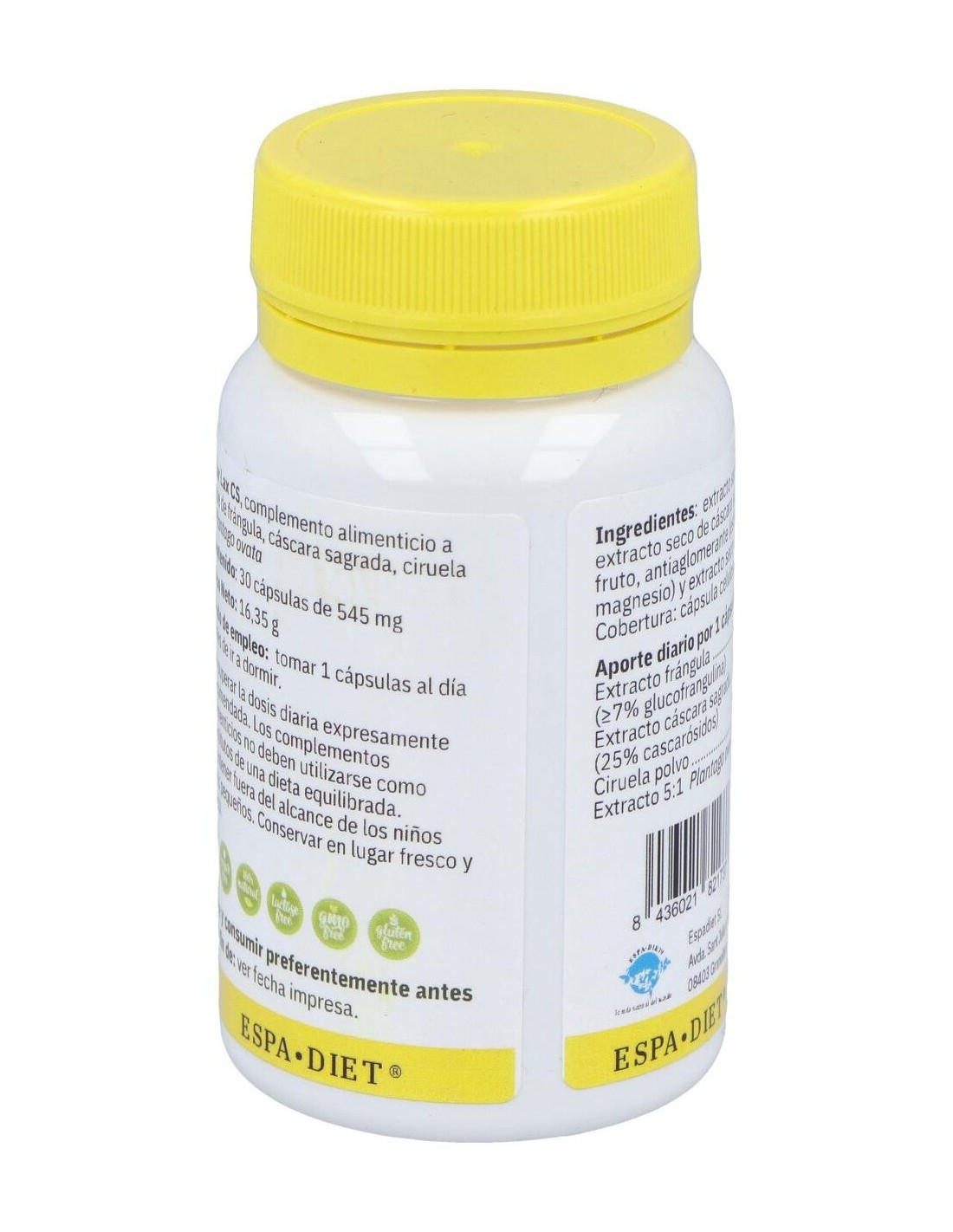 Extracto concentrado de frángula, extracto concentrado de cáscara sagrada, ciruela fruto, antiaglomerante (estearato de magnesio) y extracto concentrado de Plantago ovata. Cobertura: cápsula celulosa vegetal HPMC.