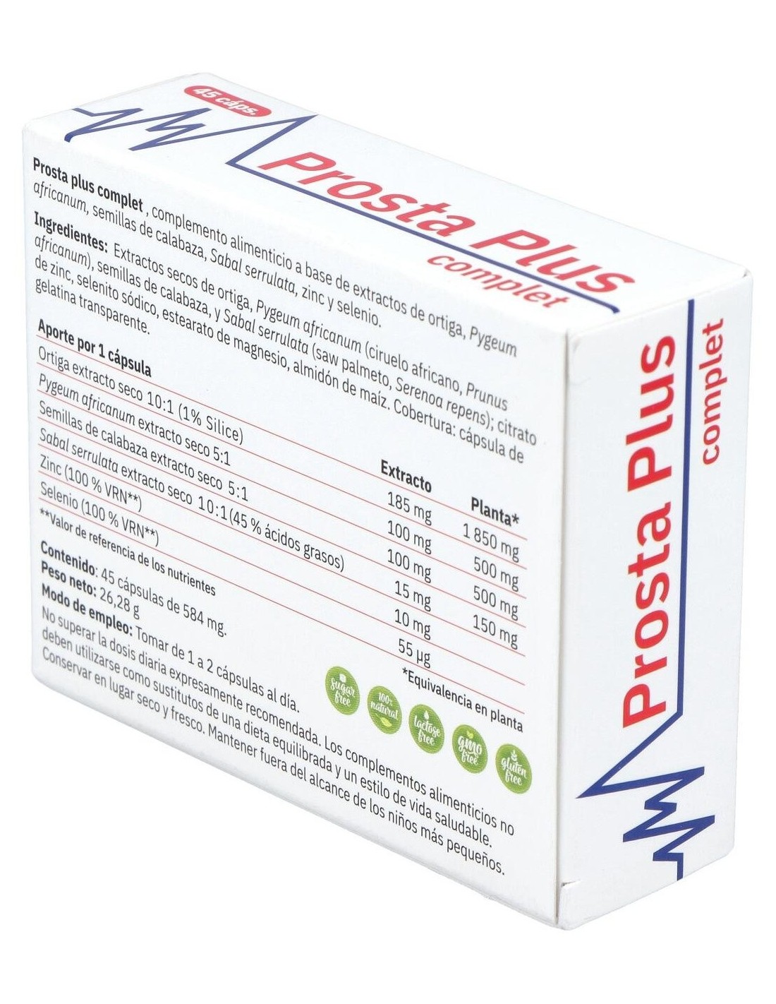 Extractos secos de ortiga, Pygeum africanum (ciruelo africano, Prunus africanum), semillas de calabaza, y Sabal serrulata (saw palmeto, Serenoa repens): citrato de zinc, selenito sódico, estearato de magnesio, almidón de maíz. Cobertura: cápsula de gelatina transparente.