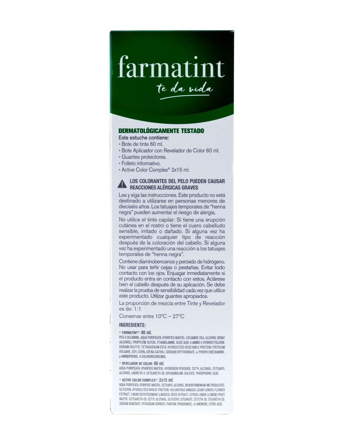 Coloración permanente: PEG-2 oleamine. Aqua purificata (purified water). Cocamide dea. Alcohol denat (alcohol). Propylene Glycol. Oleic Acid. Ethanolamine. Sodium Sulfite. Tetrasodium edta. Hydrolyzed vegetable protein (Triticum vulgare, Soy, Corn, Avena Sativa). Sodium erythorbate.p-phenylenediamine. 4 chlororesorcinol. N,N-BIS (2-hydroxyethyl)-p-phenylenediamine sulfate. 2-amino-4 hydroxyethylaminoanisole sulfate, 4-amino-2-hydroxytoluene, m-aminophenol, 2 methylresorcinol. p-aminophenol.