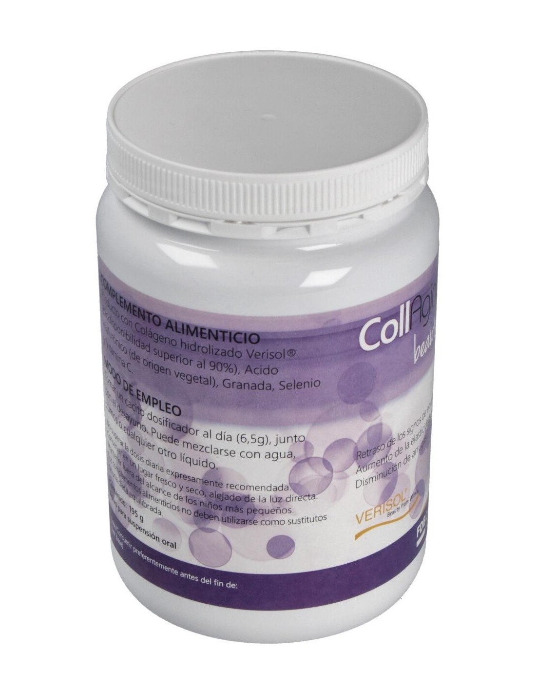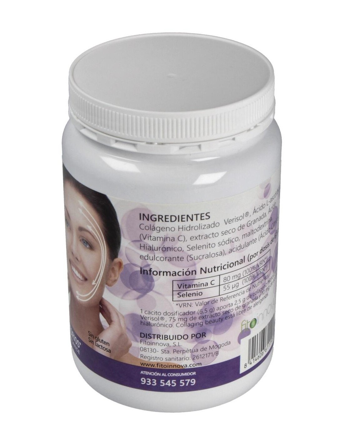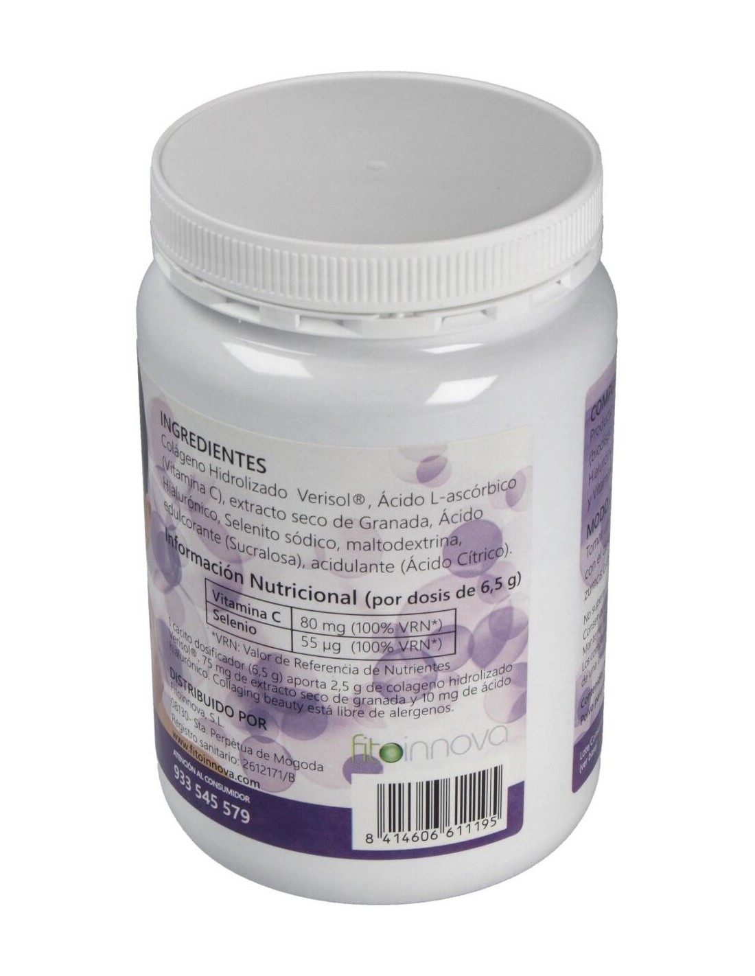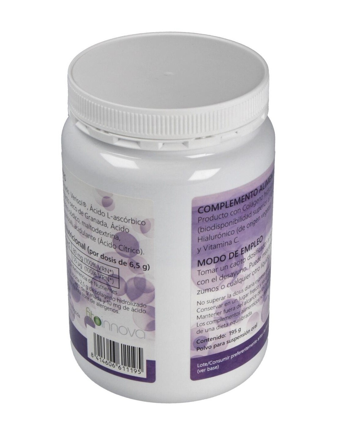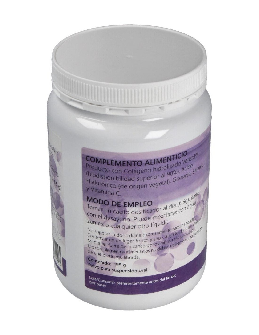 Colágeno hidrolizado verisol, ácido l-ascórbico (vitamina C), extracto seco de granada, ácido hialurónico de origen vegetal, selenito sódico, maltodextrina, edulcorante (sucralosa), acidulante (ácido cítrico).