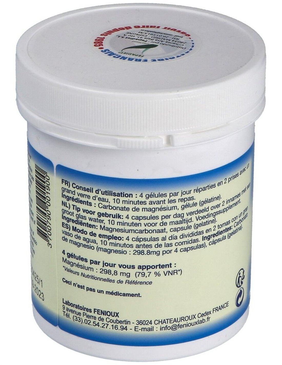 Este producto de Fenioux es un complemento alimenticio. Se trata de 200 cápsulas blandas hechas de gelatina y rellenas de magnesio y carbonato de magnesio. Este último contribuye al correcto desempeño del sistema nervioso y del cuerpo en general. Alivia el cansancio persistente y regula el equilibrio electrolítico del cuerpo humano. Además, este complemento potencia el proceso de división celular y la síntesis proteica natural. Igualmente, ayuda a mantener sanos los músculos, dientes y huesos.