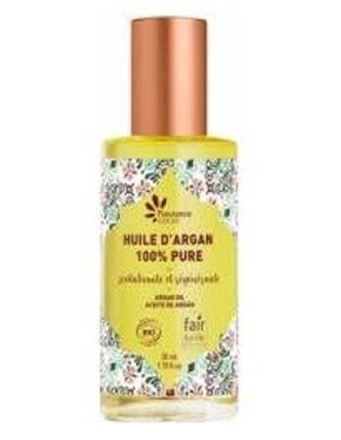Huile D'Argan Bio 100% Pure o aceite de argán 100& puro es extraído en frío, sin refinar y sin perfumar, lo que contribuye a la conservación de sus propiedades basadas en ácidos grasos esenciales como el omega 3 y vitamina E. Ayuda a regenerar y nutrir la piel, devolviéndole también su brillo. Es multifuncional, puede ser utilizado en el pelo y en las uñas también.