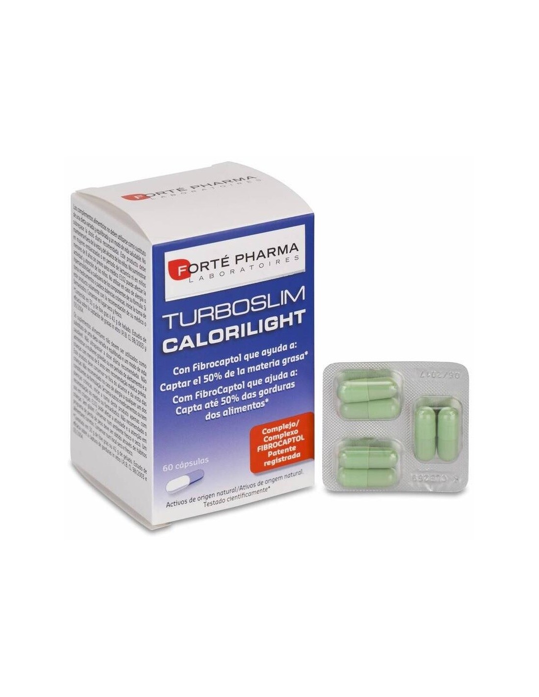 Forté Pharma Turboslim Calorilght 60cáps es un complemento alimenticio con activos de origen natural. Su fórmula se basa en el fibrocaptol, una asociación de fibras de naranja y de cacao con una fuerte acción lipoabsorbente.