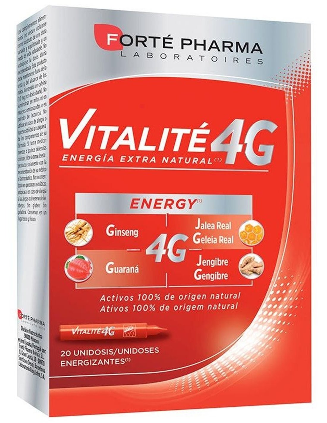 Forté Pharma Vitalité 4G Energy Unidosis 20uds es un suplemento que aporta energía de origen natural gracias a su complejo 4G, que incluye ginseng, guaraná, jalea real y jengibre. Ayuda a reducir el cansancio y la fatiga y contribuye al bienestar del organismo.