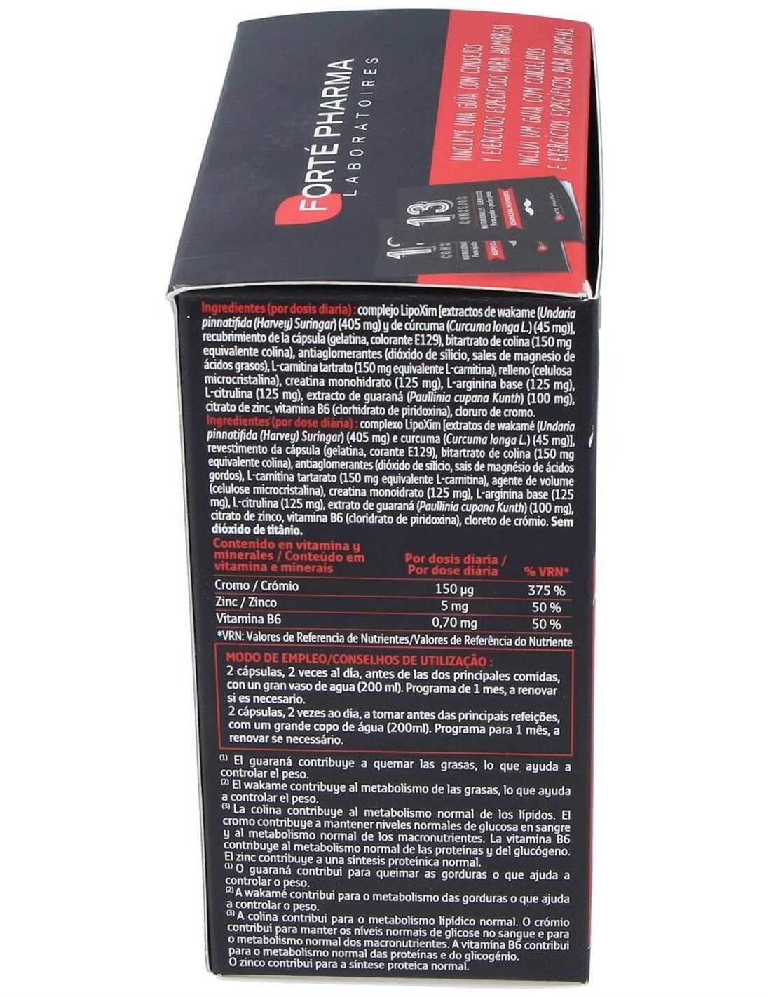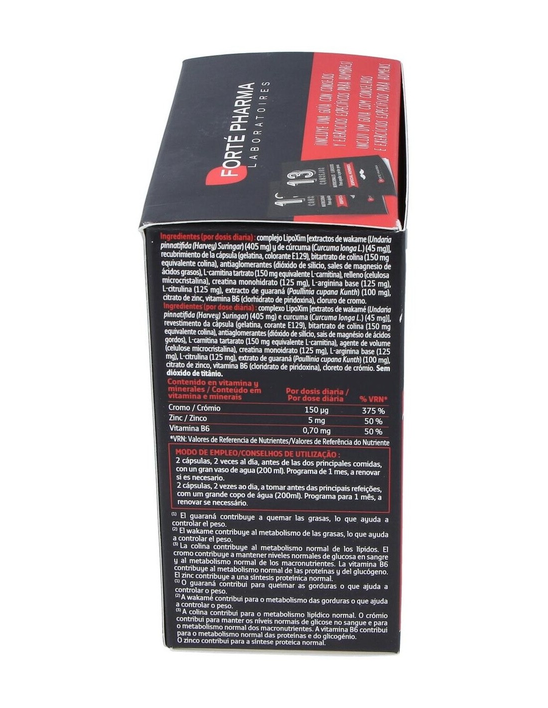 COMPLEXE LIPOXIM [EXTRAITS DE WAKAMÉ (UNDARIA PINNATIFIDA (HARVEY) SURINGAR) (405 M) ET DE CURCUMA (CURCUMA LONG L.) (45 MG)], ENVELOPPE DE LA GÉLULE (GÉLATINE, COLORANT ROUGE ALLURA AC), BITARTRATE DE CHOLINE (150 MG ÉQUIVALENT CHOLINE), ANTIAGGLOMÉRANTS (DIOXYDE DE SILICIUM, SELS DE MAGNÉSIUM D'ACIDES GRAS), L-CARNITINE TARTRATE (150 MG ÉQUIVALENT L-CARNITINE), AGENT DE CHARGE (CELLULOSE MICROCRISTALLINE), CRÉATINE MONOHYDRATE (125 MG), EXTRAIT DE GUARANA (PAULLINIA CUPANA KUNTH) (100 MG), CITRATE DE ZINC, VITAMINE B6 (CHLORHYDRATE DE PYRIDOXINE), CHLORURE DE CHROME. SANS DIOXYDE DE TITANE.