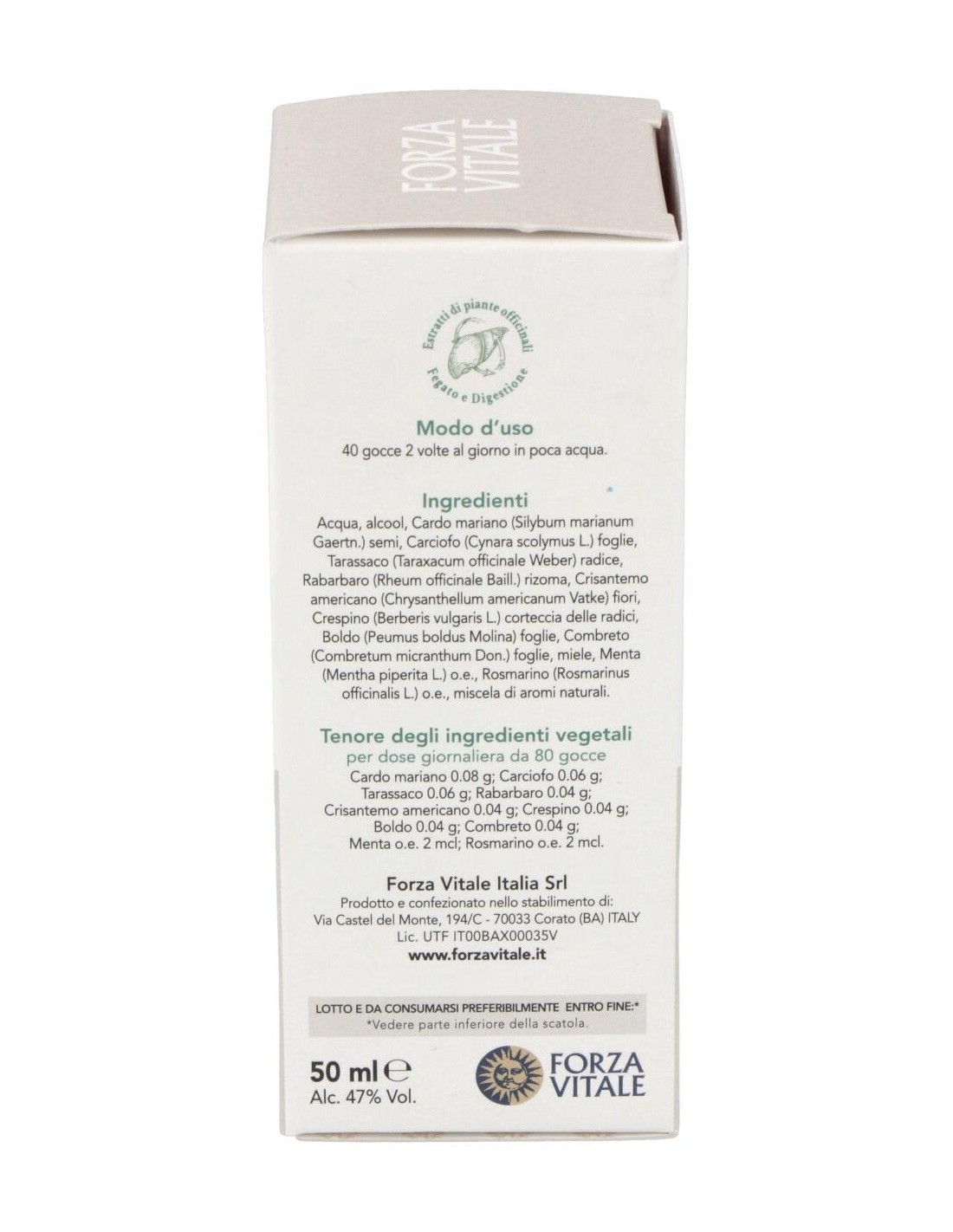 Cardo 0.08 g: Alcachofera 0.06 g: Diente de león 0.06 g: Ruibarbo 0.04 g: Crisantemo americano 0.04 g: Berberis 0.04 g: Boldo 0.04 g: Combreto 0.04 g: Menta a.e. 2 µl: Romero a.e. 2 µl.